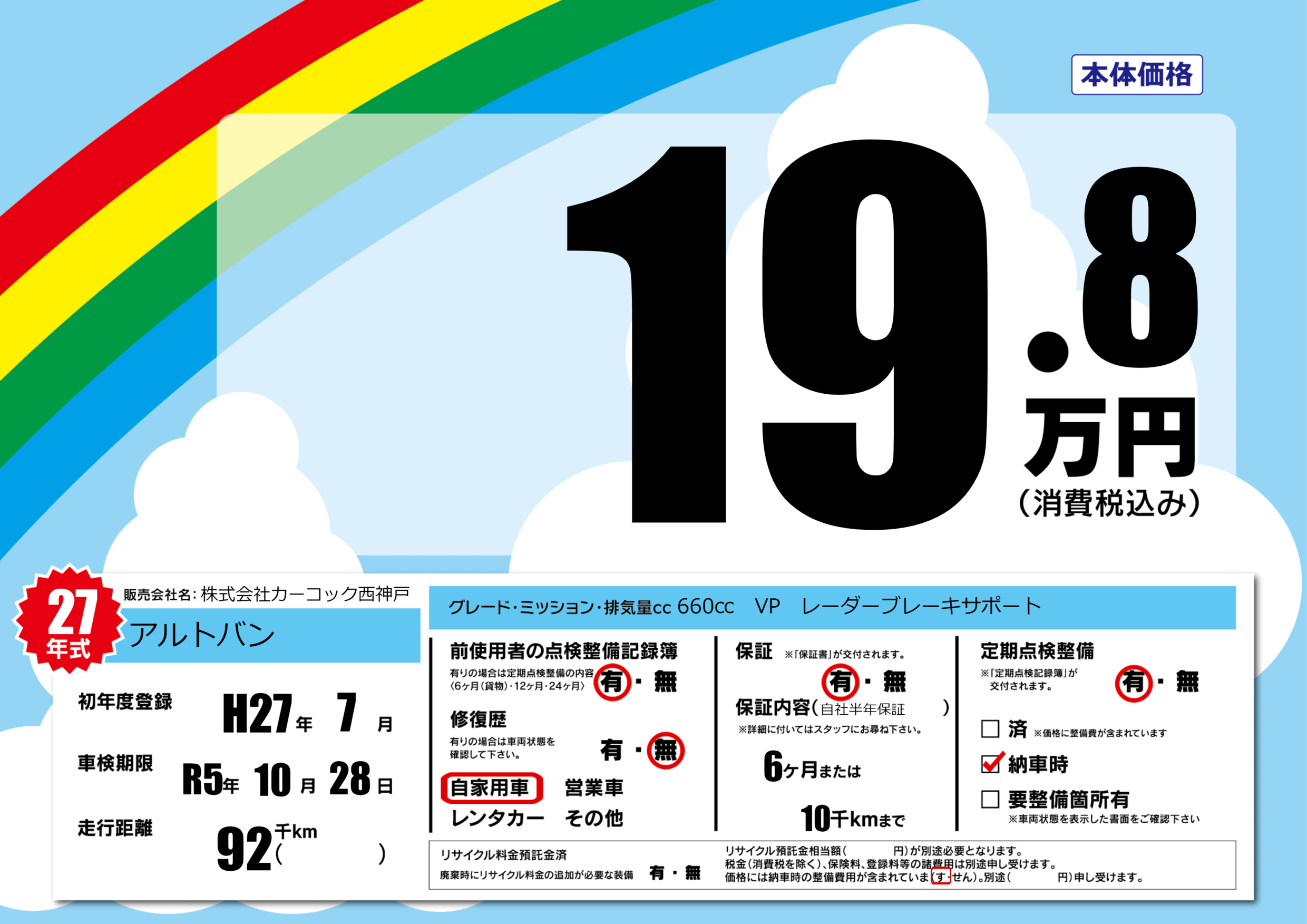 | 走行キロ | 9.2万km | 初年度登録 | H27年7月 |