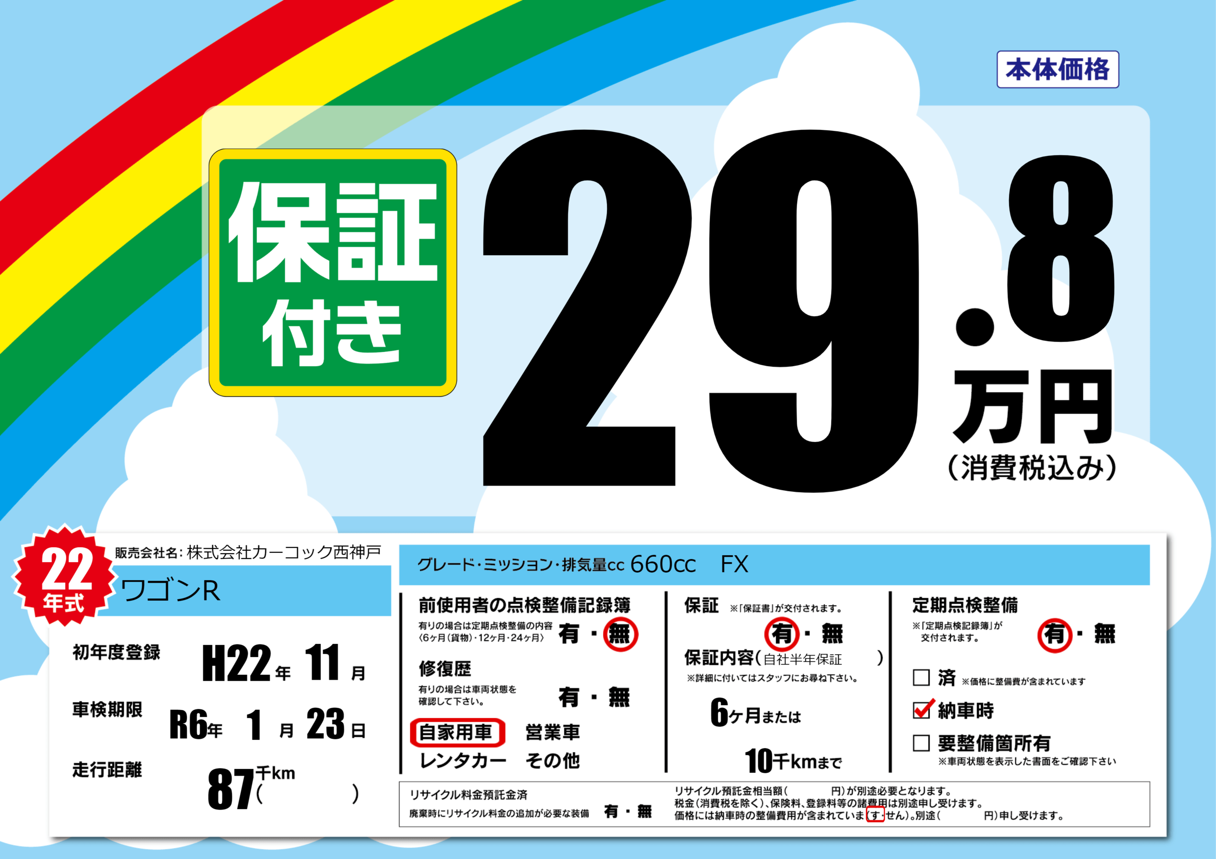 保証付き 保証内容(自社半年保証) 6ヶ月または(10)千kmまで |