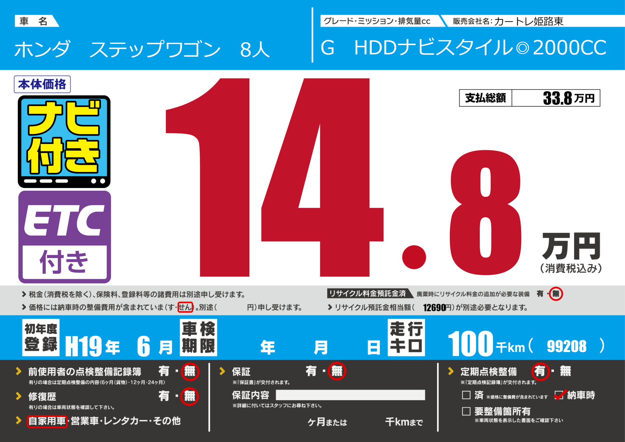 | 定期点検整備 | 定期点検整備あり 納車時あり | ||