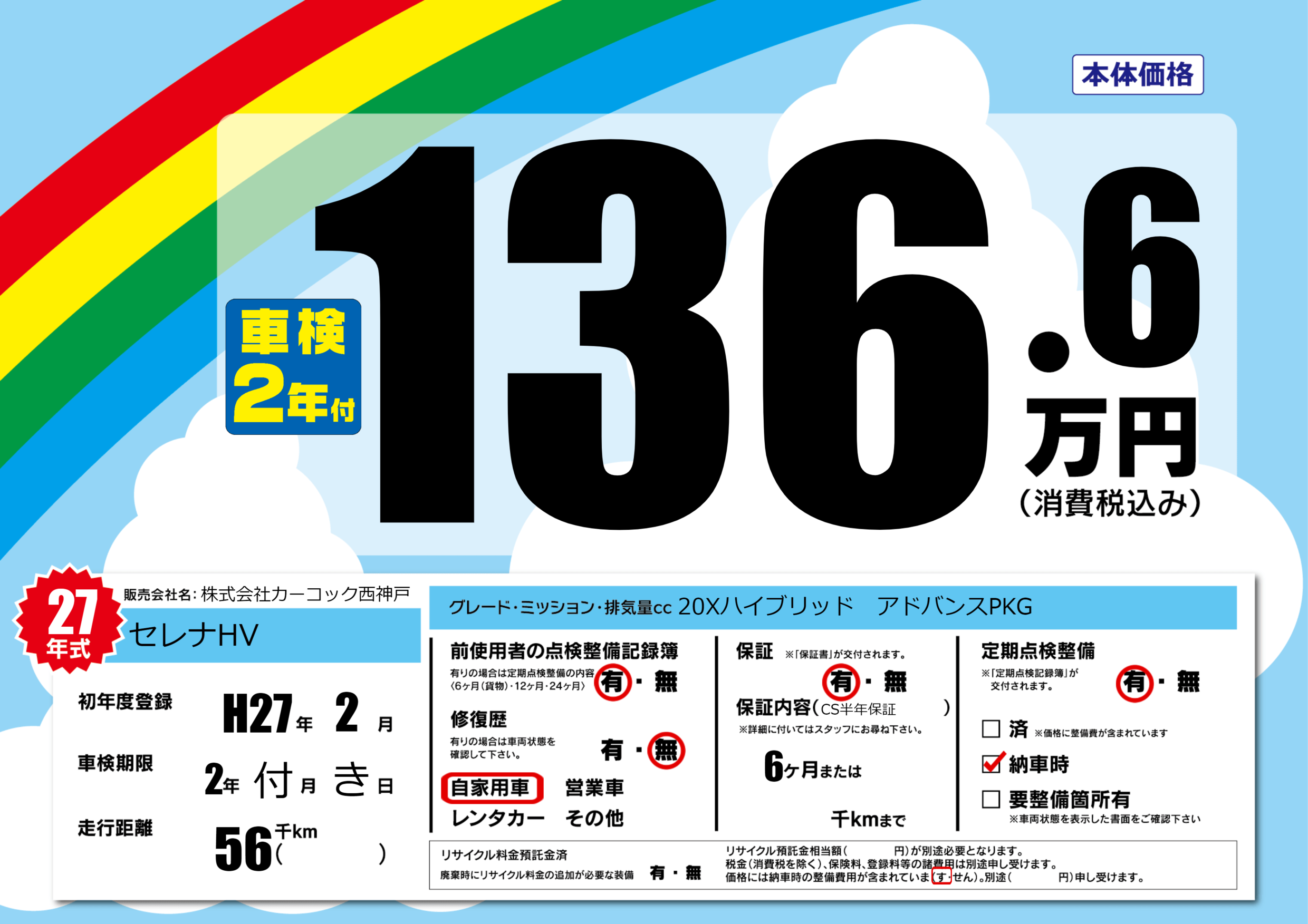 | 走行キロ | 5.6万km | 初年度登録 | H27年2月 |