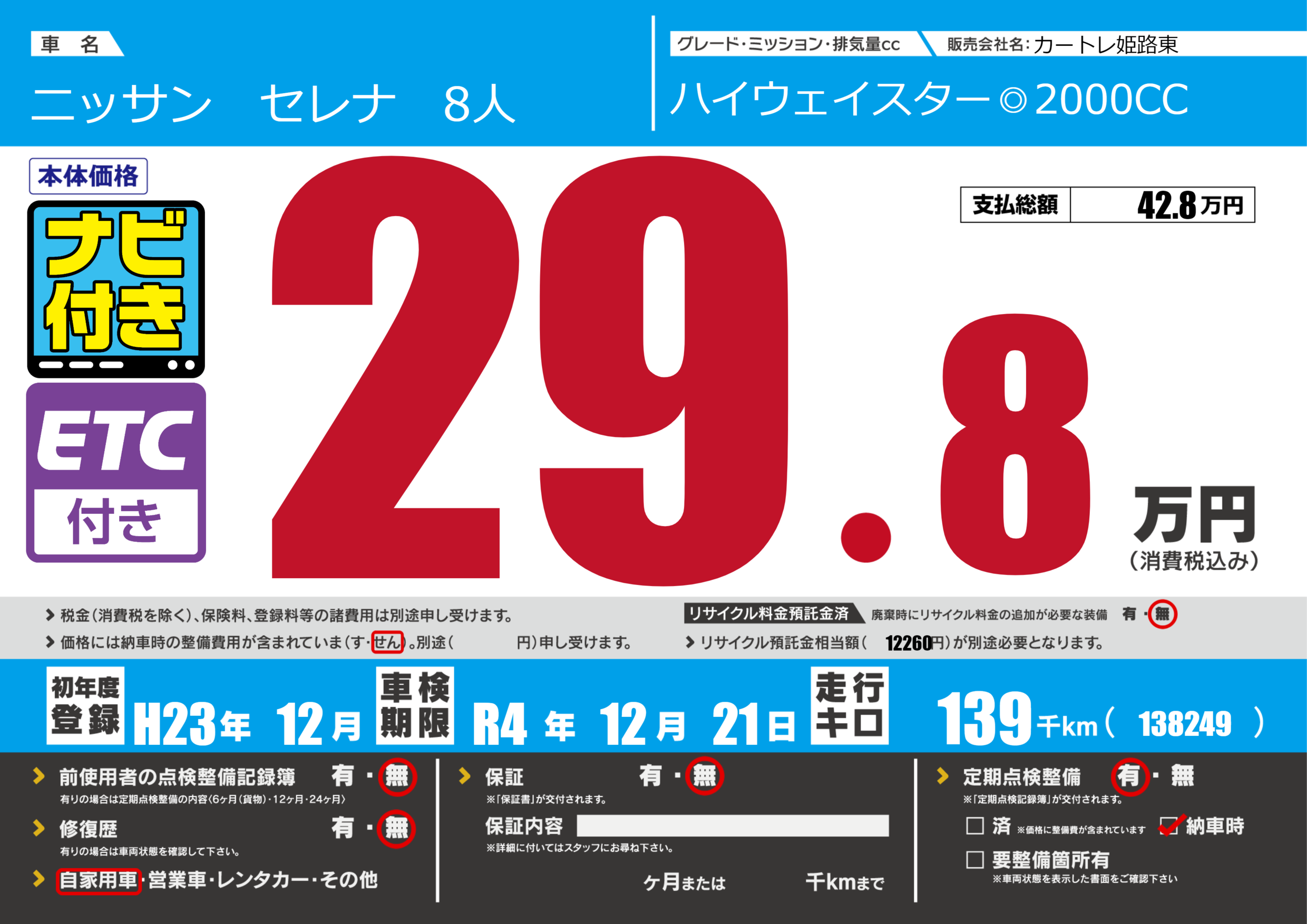 | 走行キロ | 13.9万km | 初年度登録 | H23年12月 |