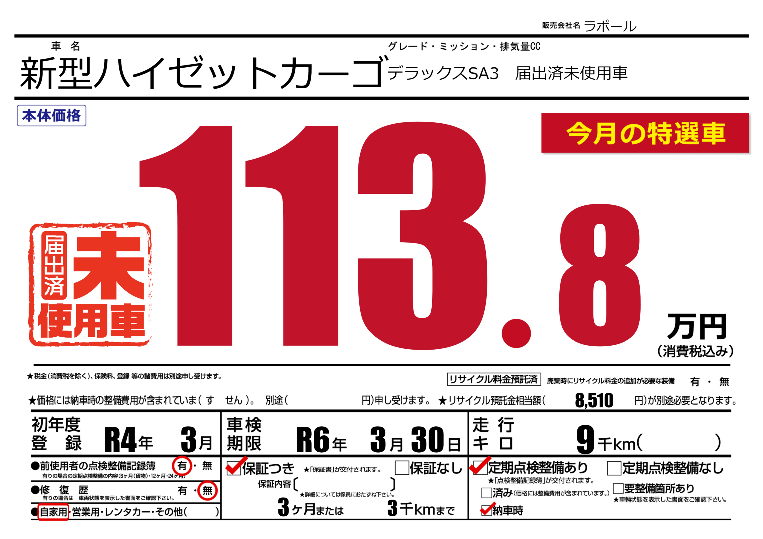 | 走行キロ | 0.9万km | 初年度登録 | R4年3月 |
