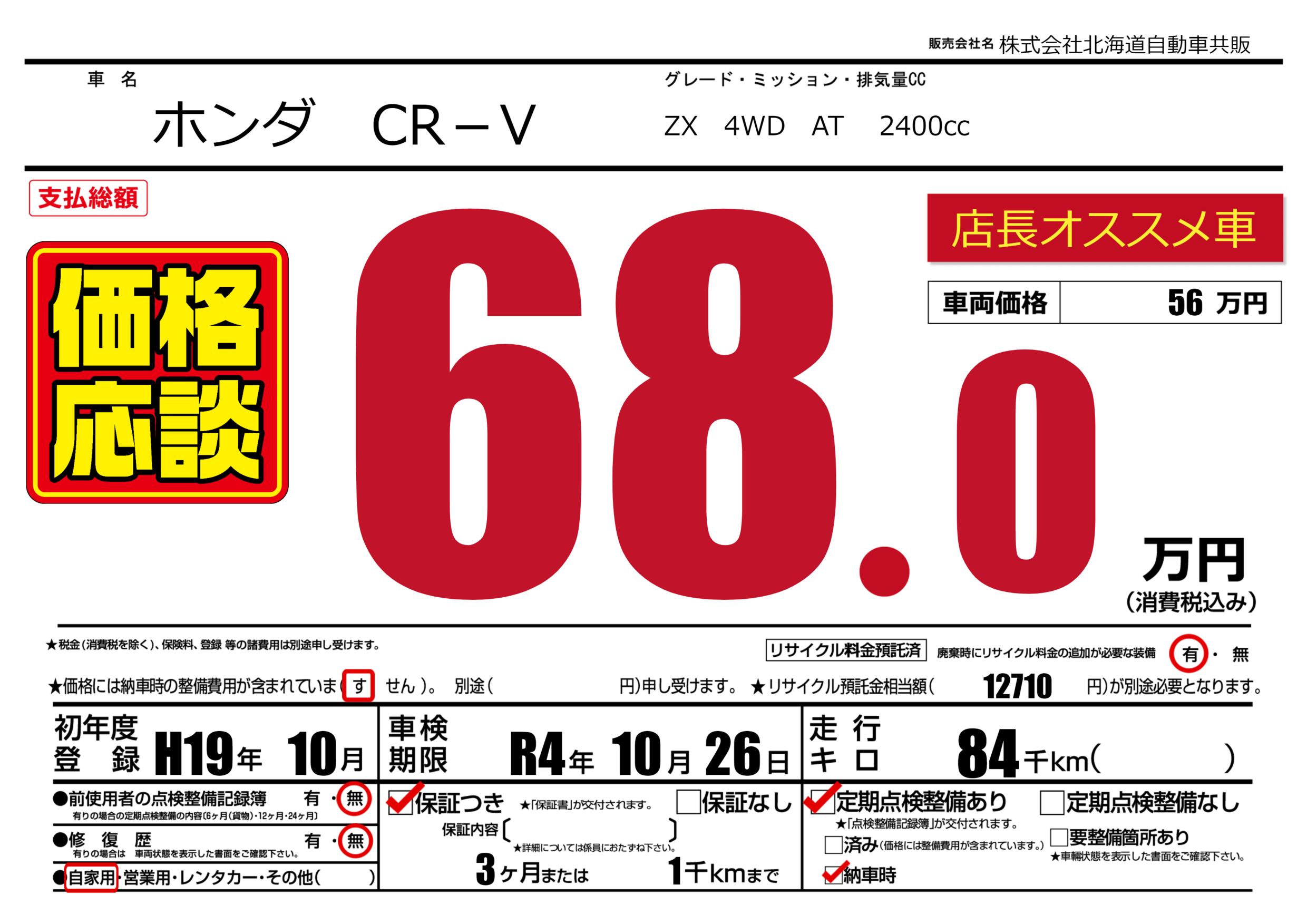 | 車名 | ホンダ CR-V | グレード ミッション 排気量 |