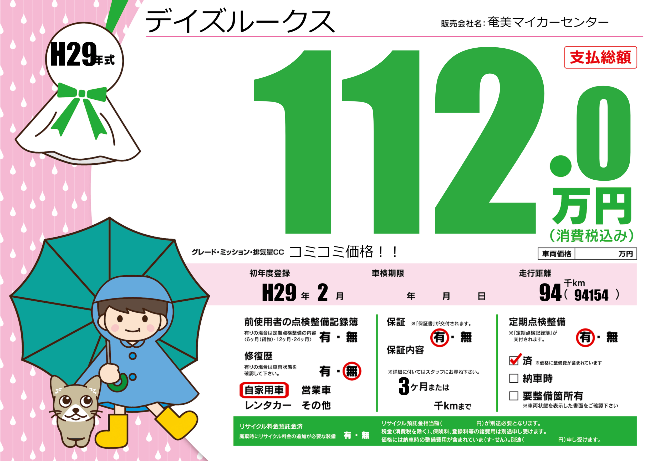 | 走行キロ | 9.4万km | 初年度登録 | H29年2月 |