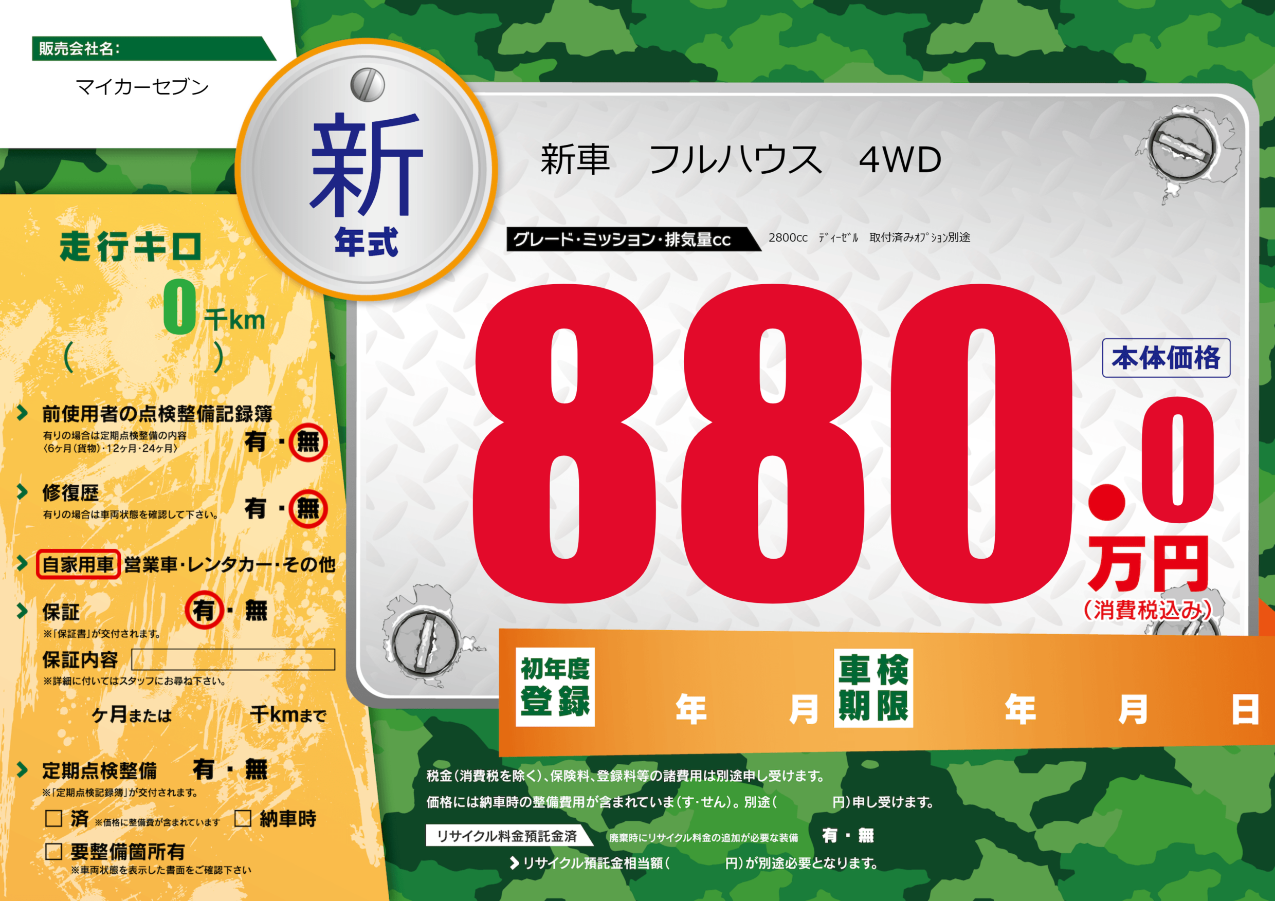 | 車名 | 新車 フルハウス 4WD | グレード ミッション 排気量 |