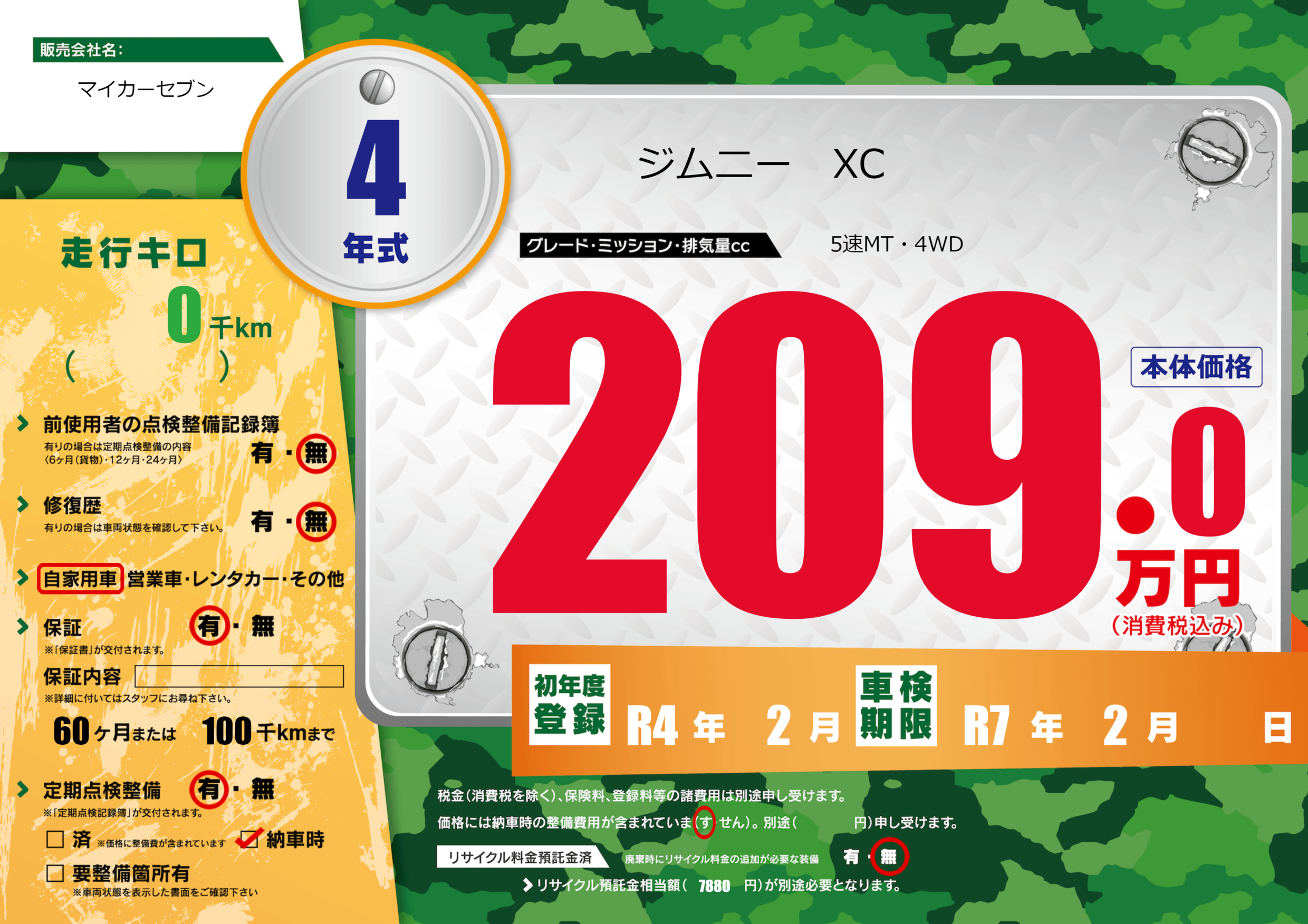 | 車名 | ジムニー XC | グレード ミッション 排気量 |