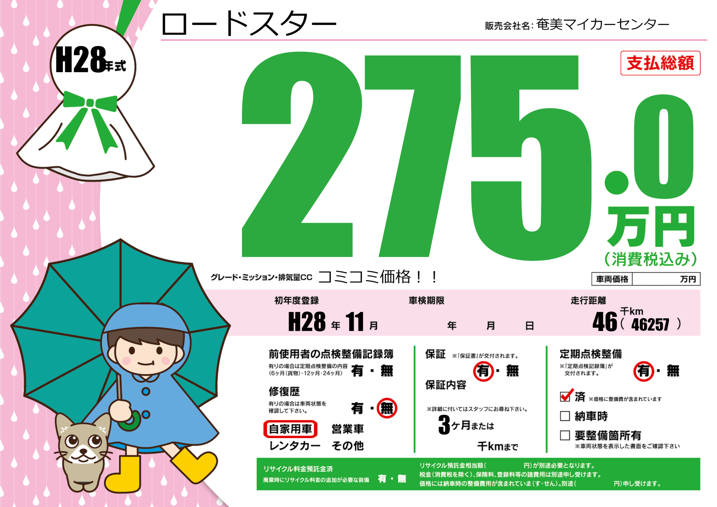 | 走行キロ | 4.6万km | 初年度登録 | H28年11月 |