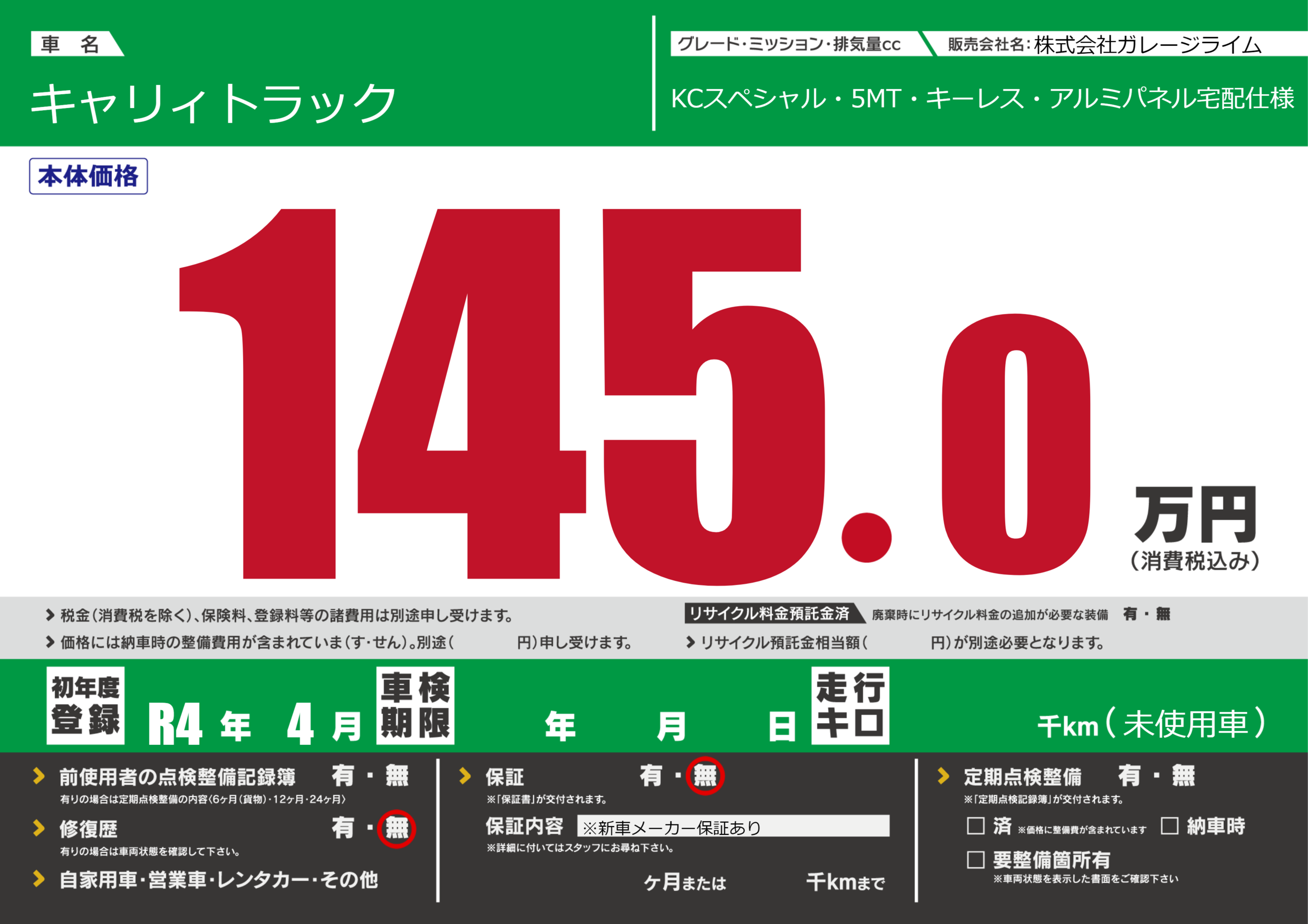 | 車名 | キャリィトラック | グレード ミッション 排気量 |