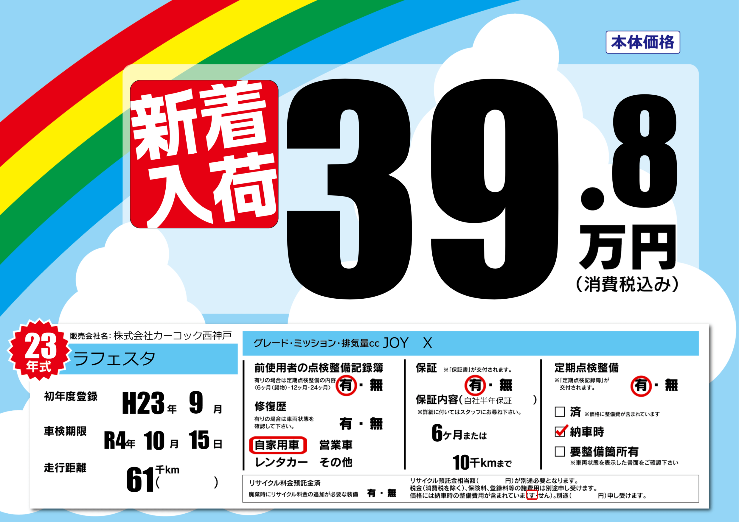 | 走行キロ | 6.1万km | 初年度登録 | H23年9月 |