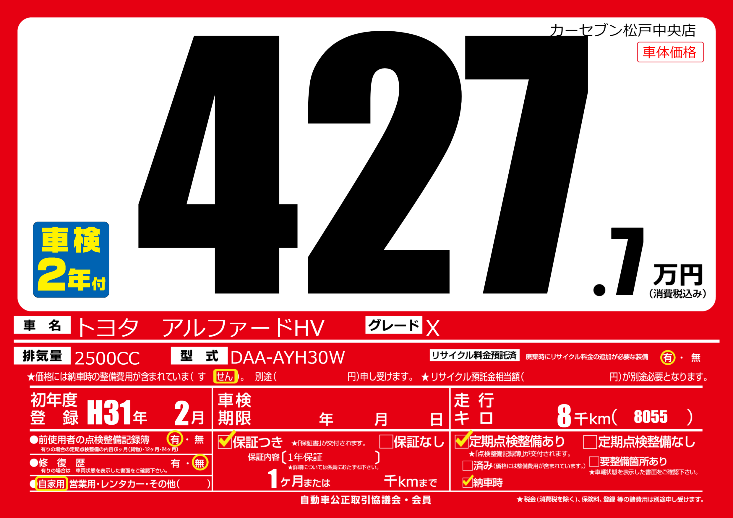 | 車名 | トヨタ アルファードHV | グレード ミッション 排気量 |