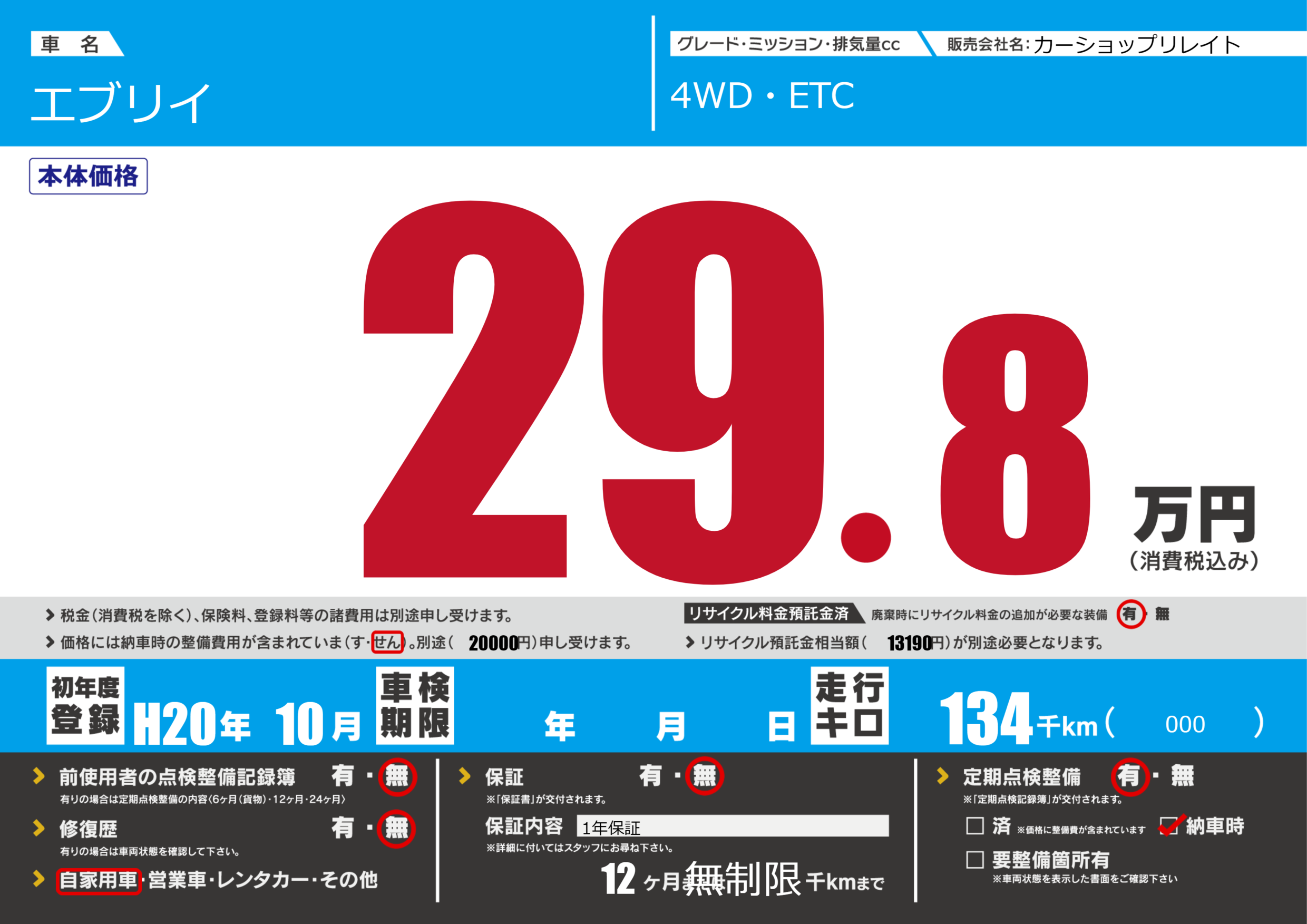 | 定期点検整備 | 定期点検整備あり 納車時あり | ||