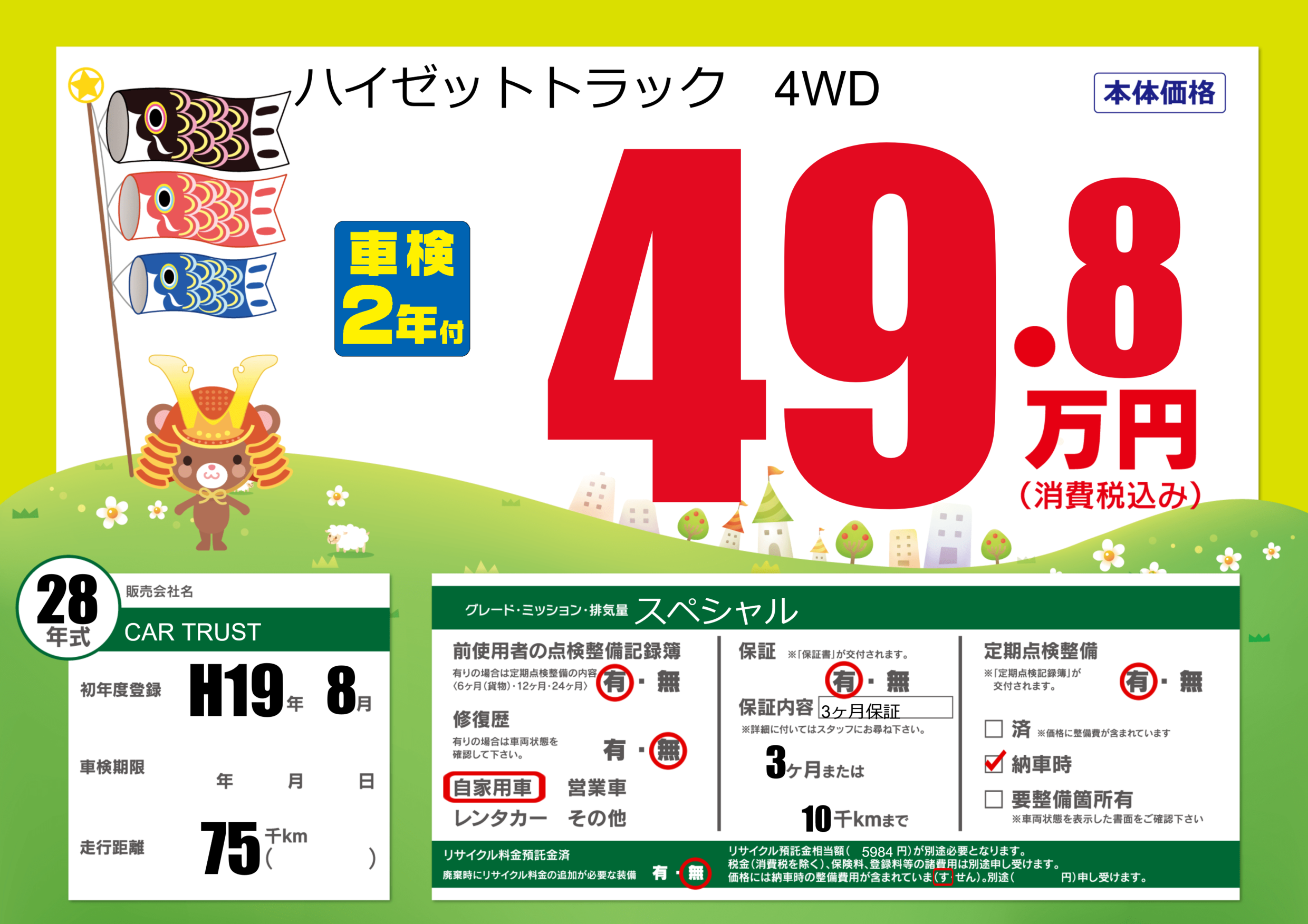 | 車名 | ハイゼットトラック 4WD | グレード ミッション 排気量 |