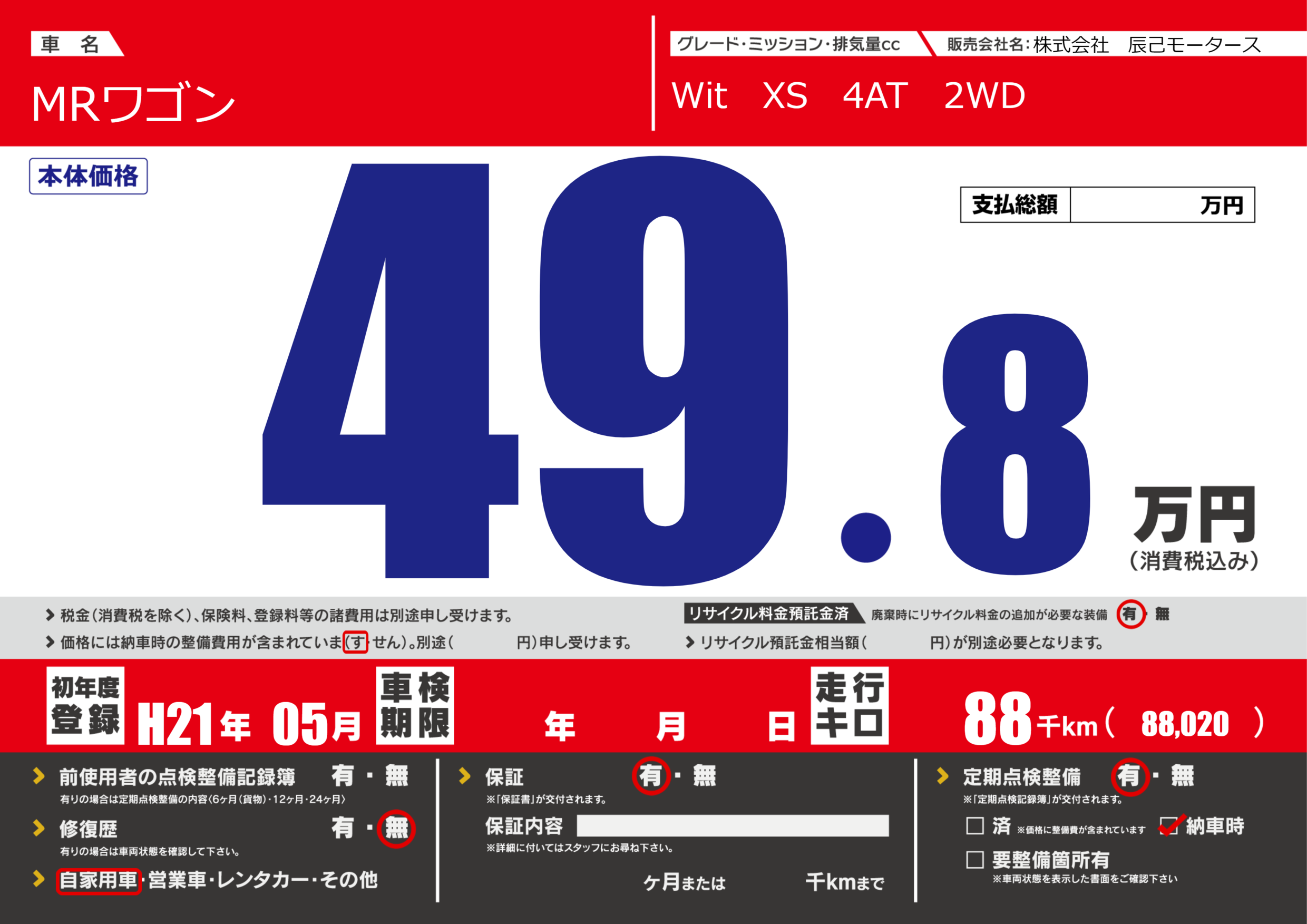 | 車名 | MRワゴン | グレード ミッション 排気量 |