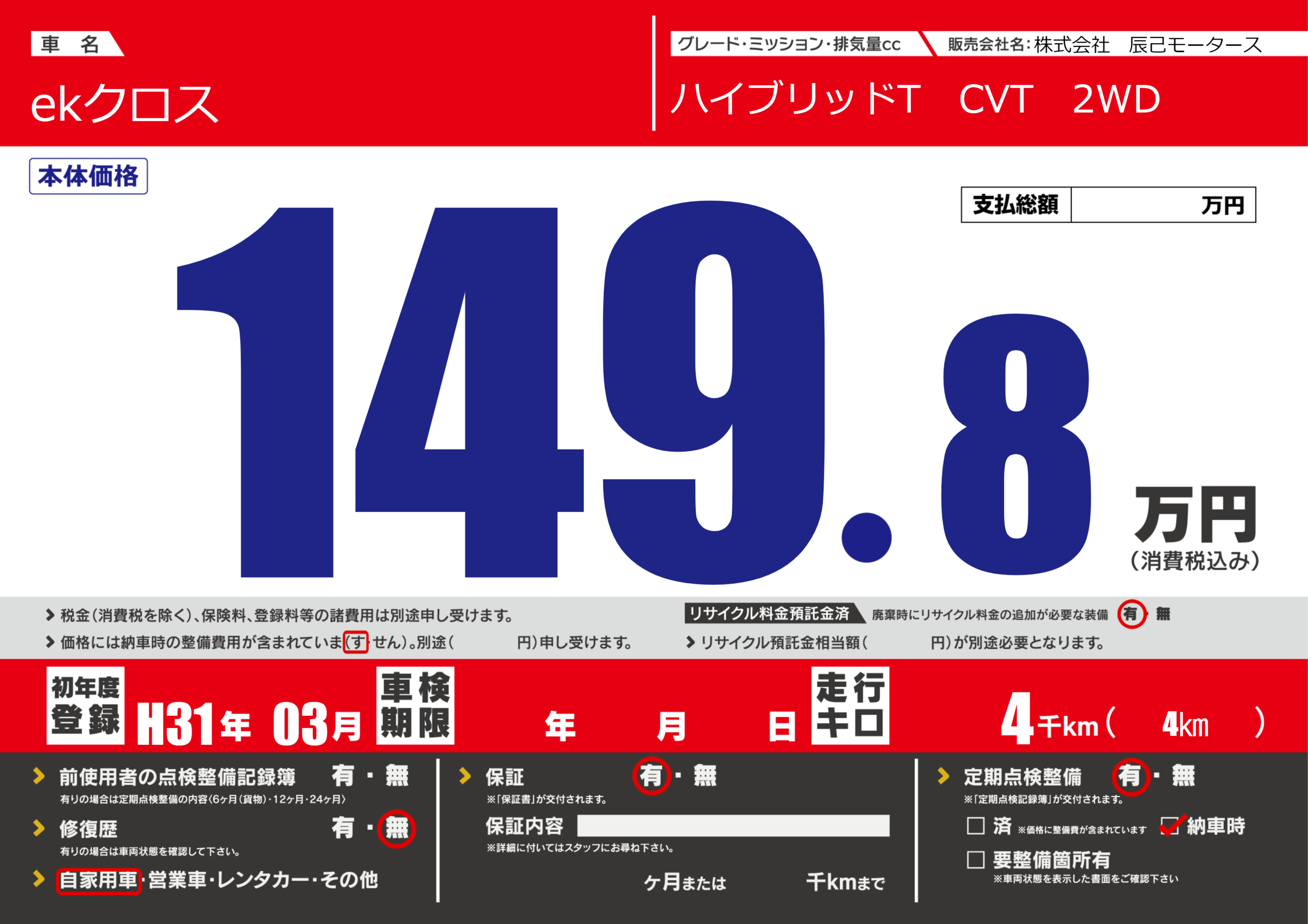| 定期点検整備 | 定期点検整備あり 納車時あり | ||