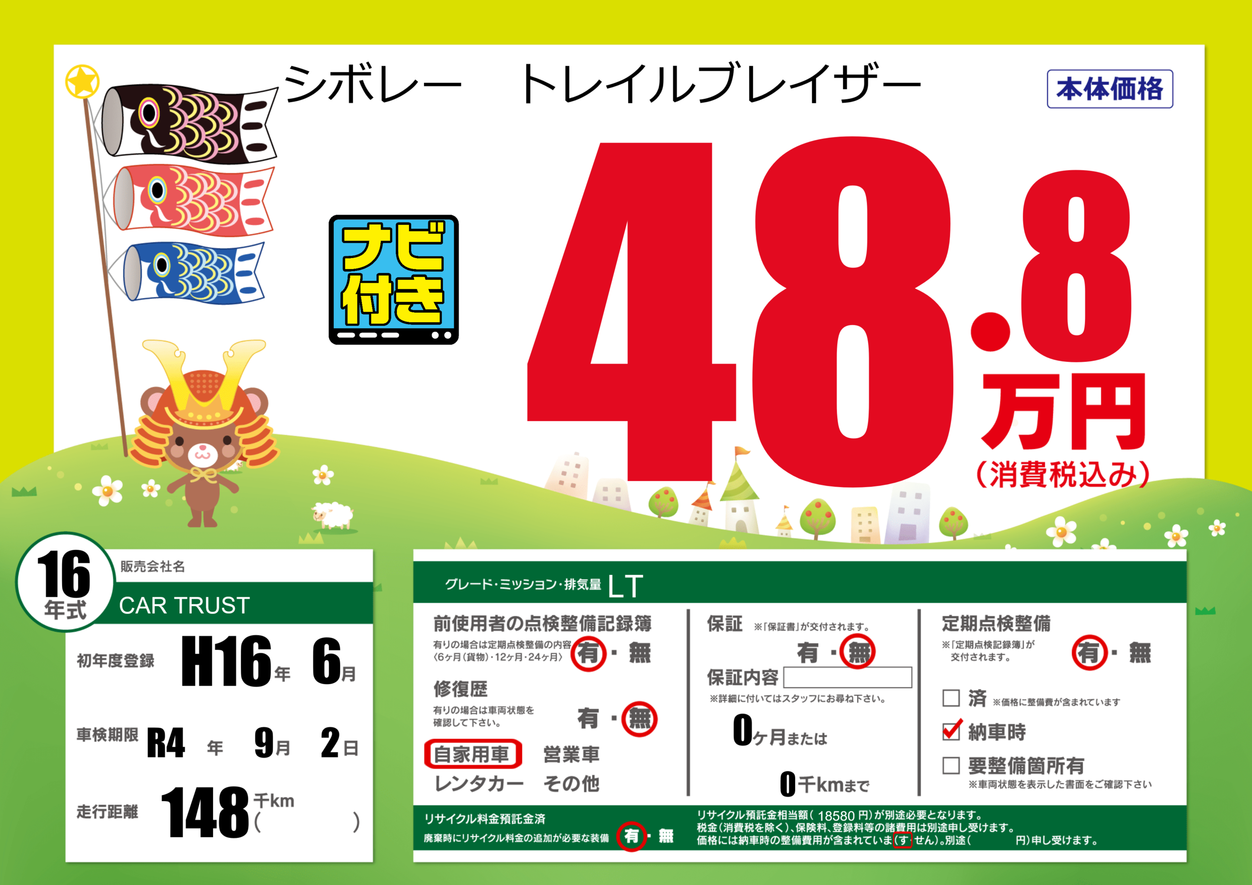 | 走行キロ | 14.8万km | 初年度登録 | H16年6月 |