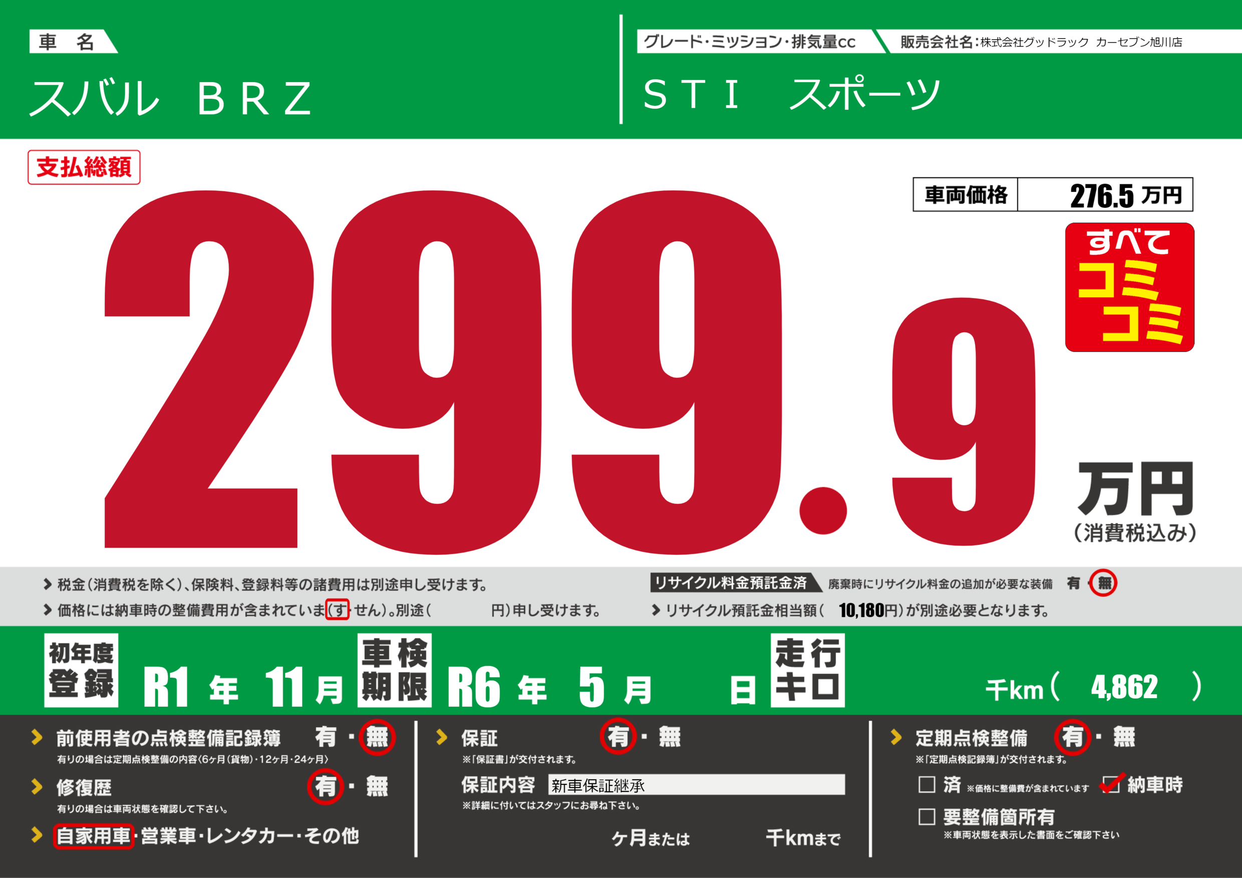 | 車名 | スバル BRZ | グレード ミッション 排気量 |