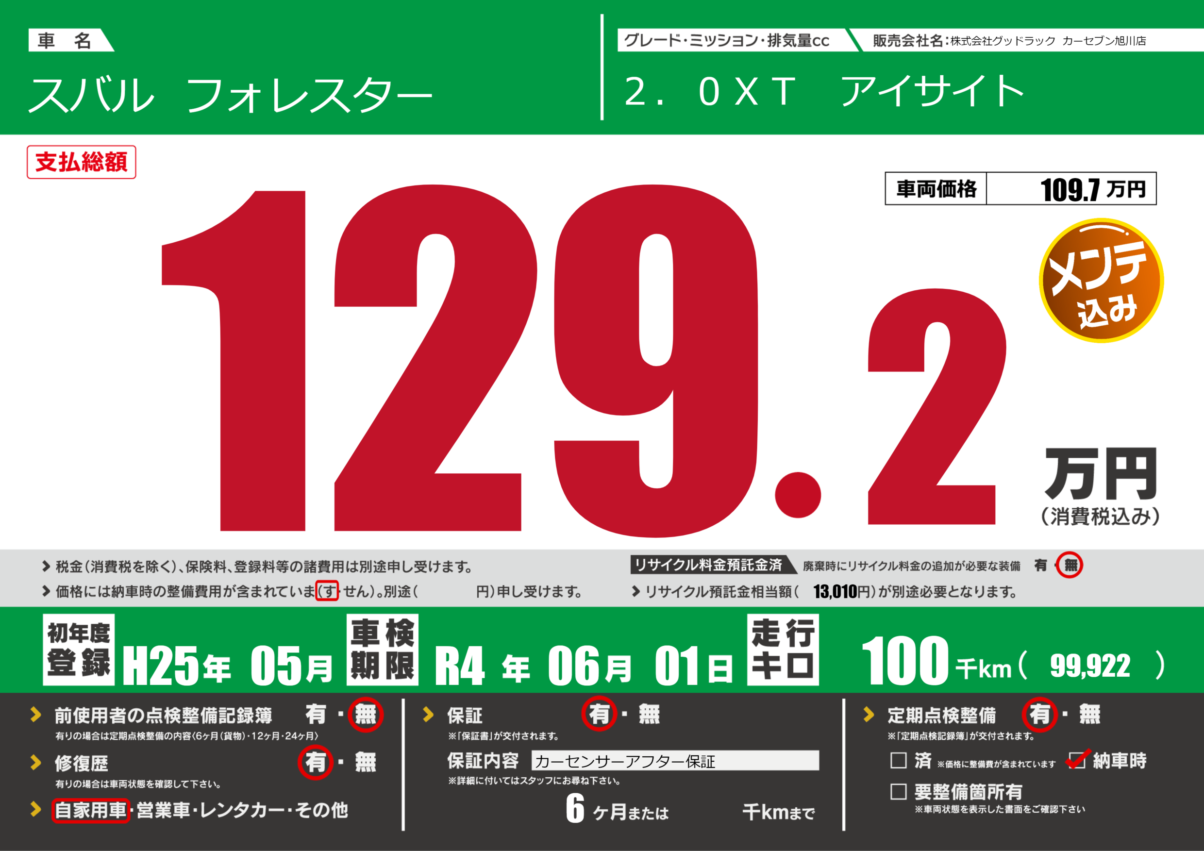 | 車名 | スバル フォレスター | グレード ミッション 排気量 |