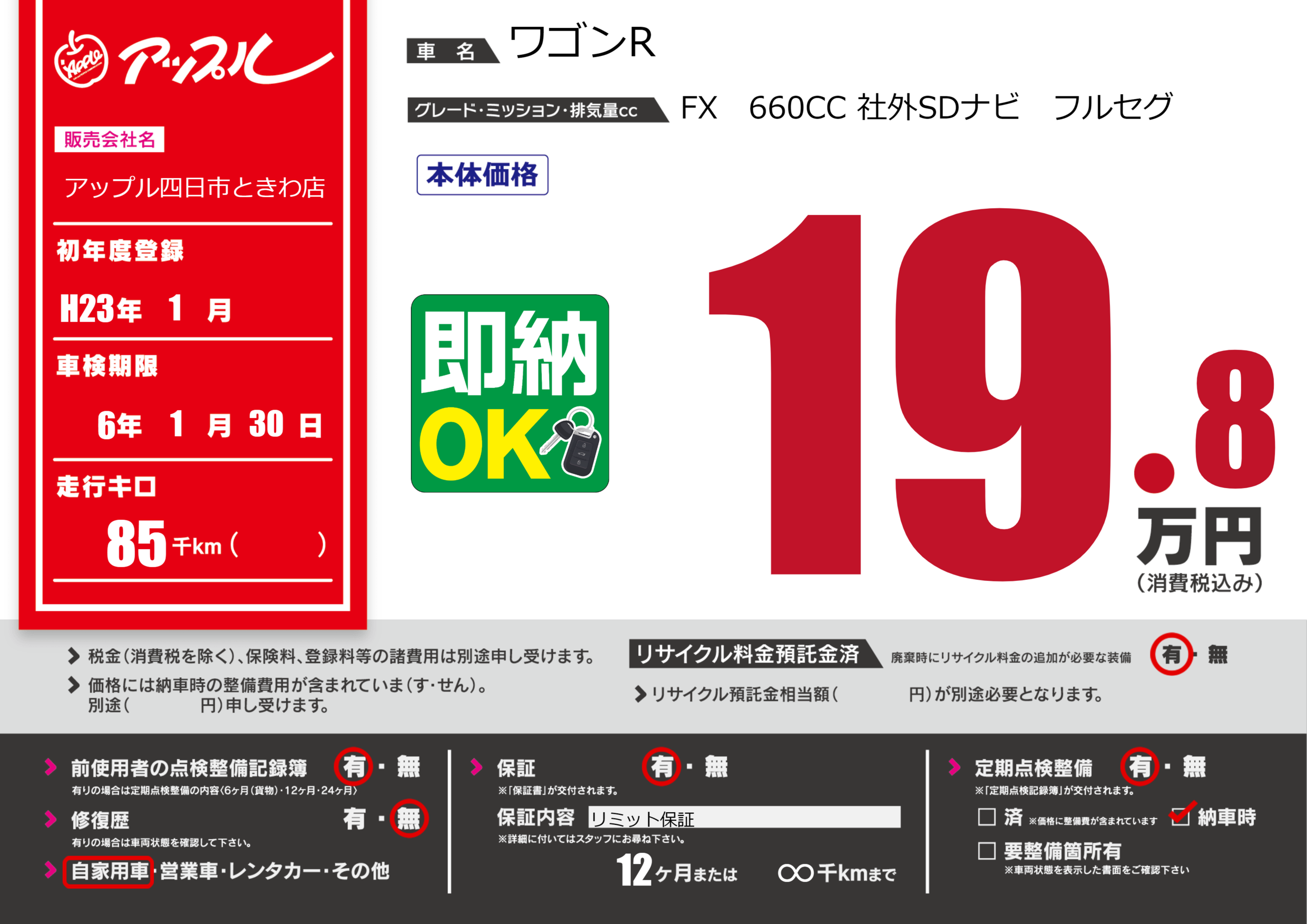 | 走行キロ | 8.5万km | 初年度登録 | H23年1月 |