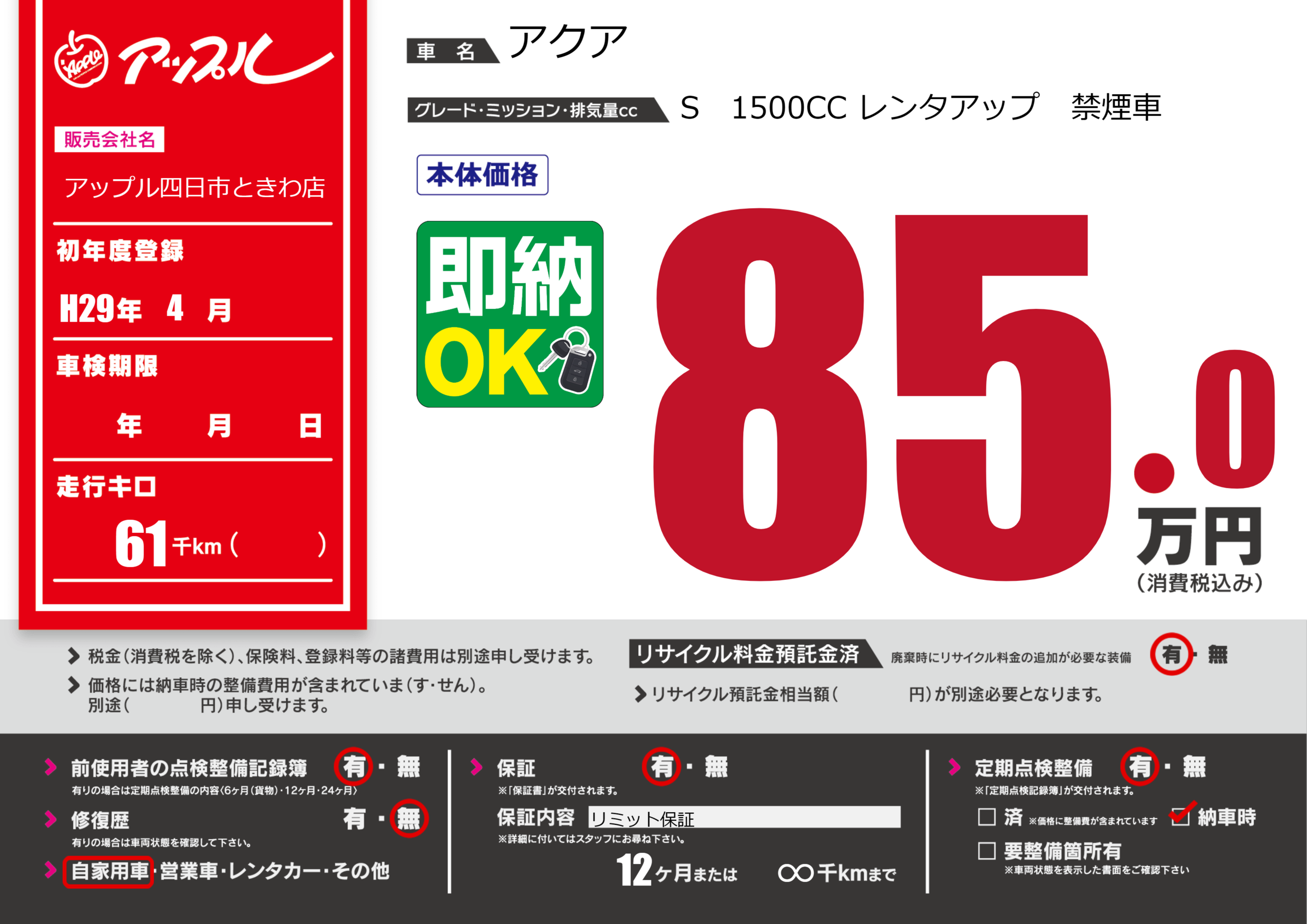 | 走行キロ | 6.1万km | 初年度登録 | H29年4月 |