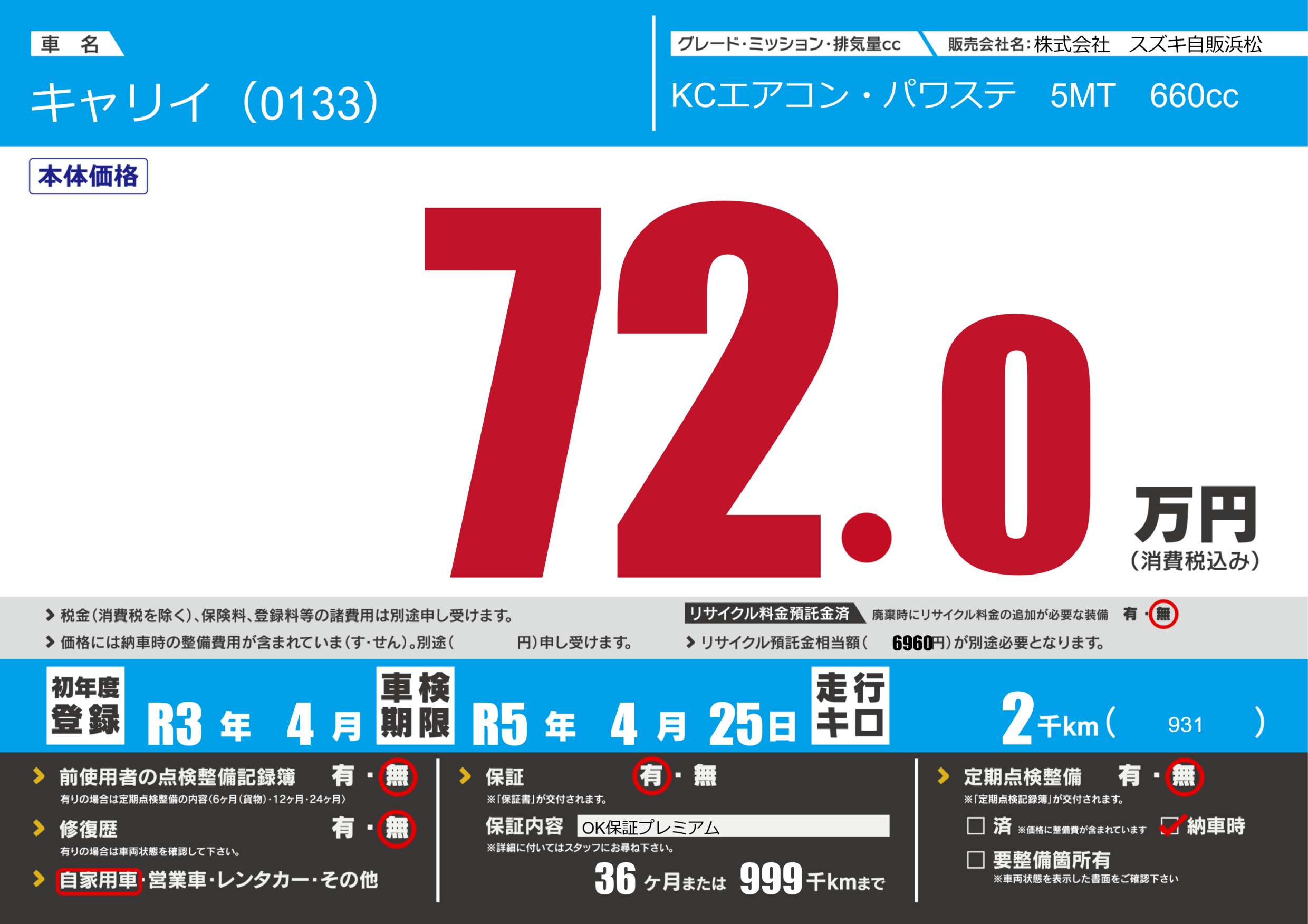 保証付き 保証内容(OK保証プレミアム) 36ヶ月または(999)千kmまで |