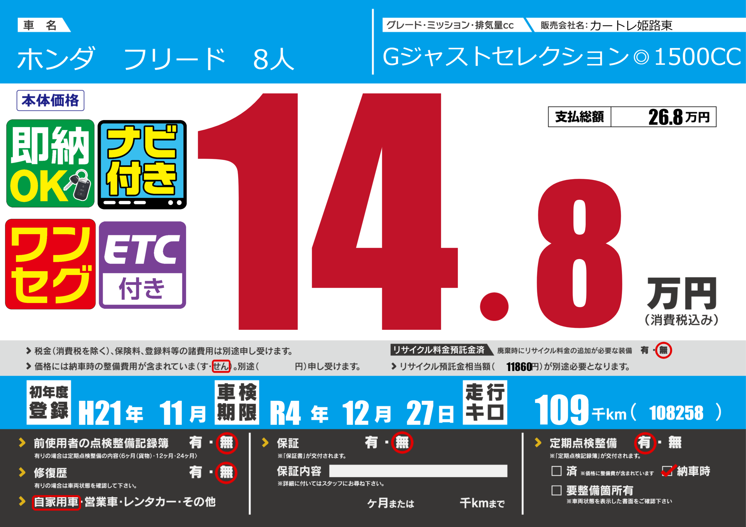 | 車名 | ホンダ フリード 8人 | グレード ミッション 排気量 |
