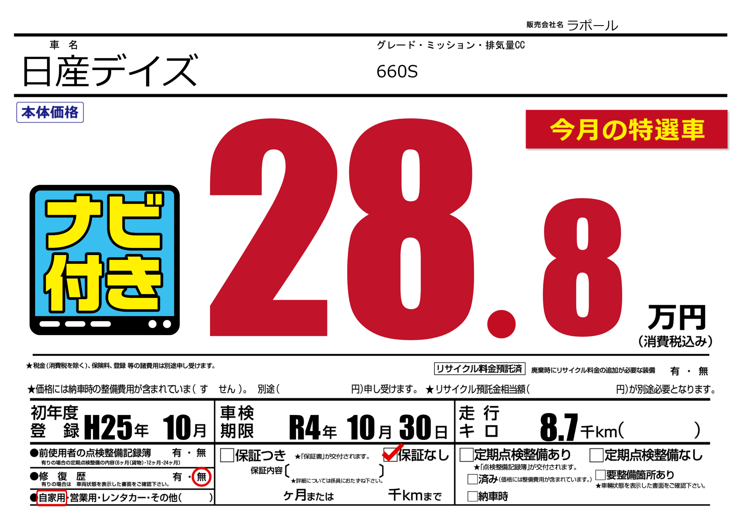 なし | 車検制限 | R4年10月30月 |