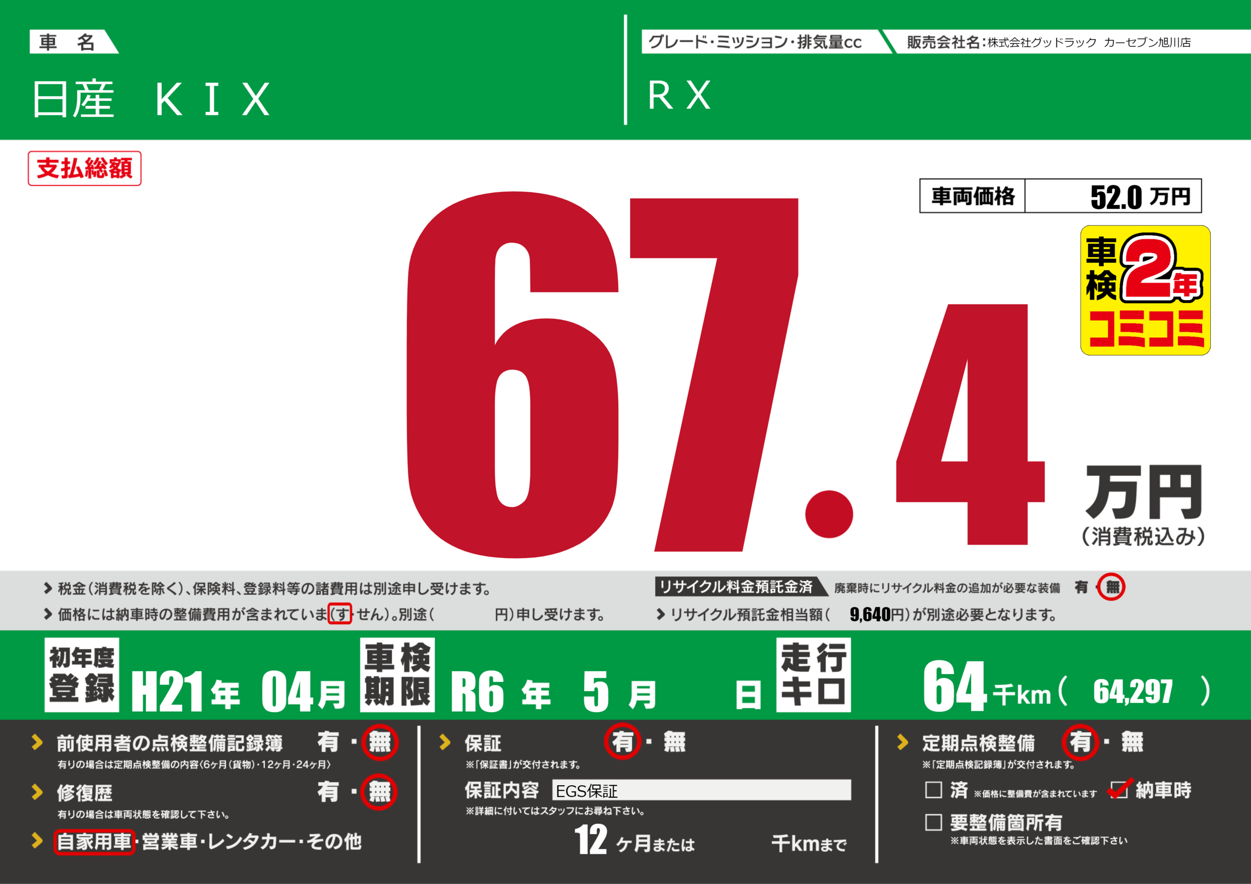 | 車名 | 日産 KIX | グレード ミッション 排気量 |