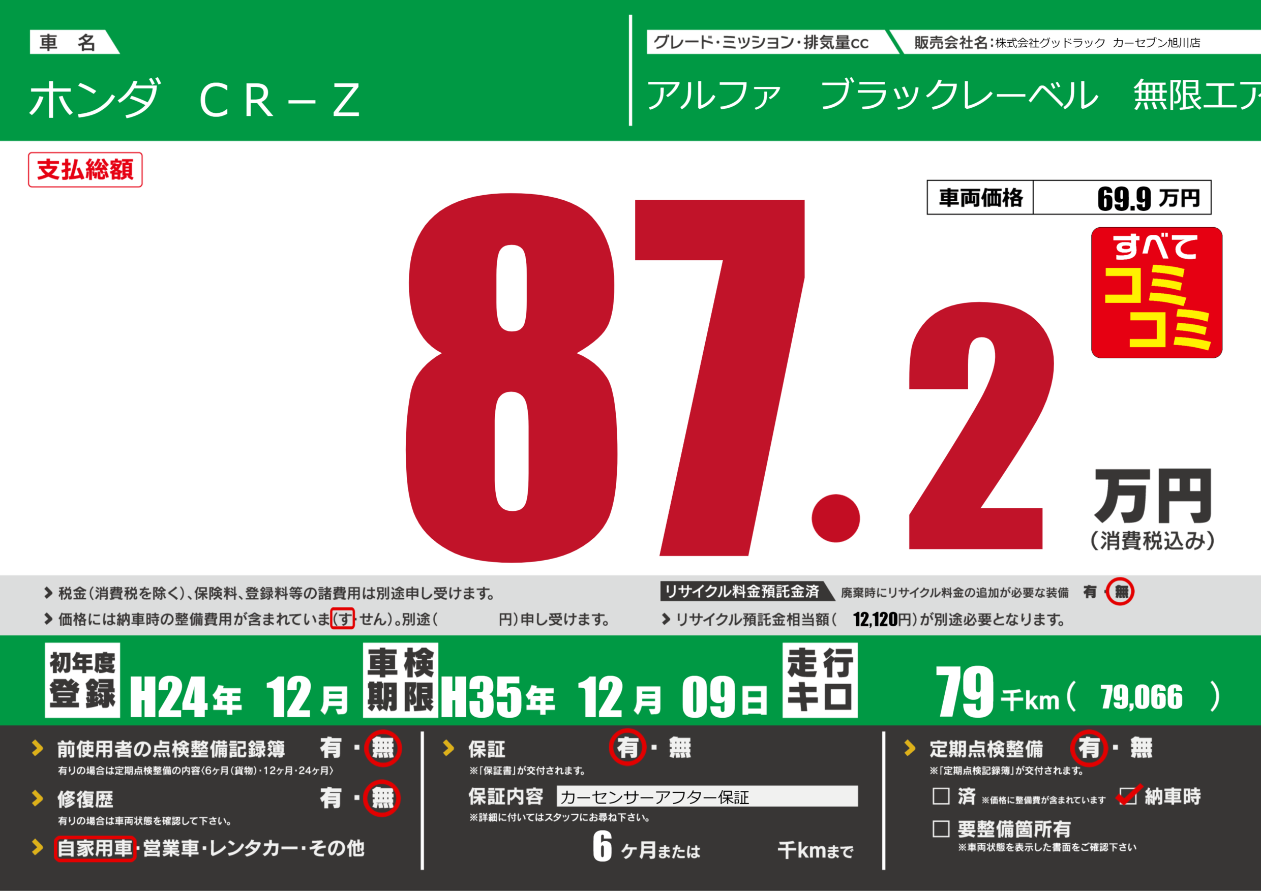 | 走行キロ | 7.9万km | 初年度登録 | H24年12月 |