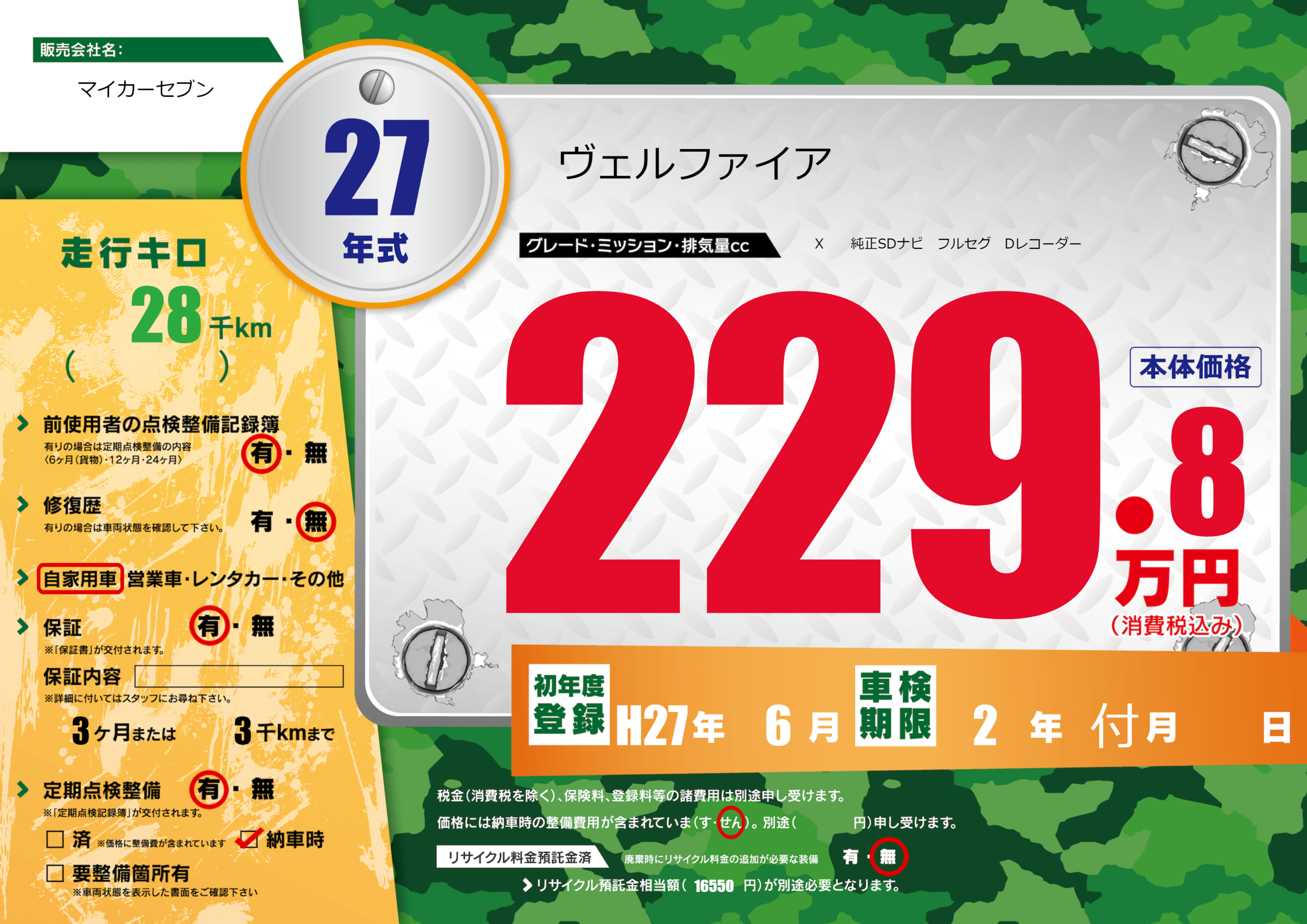 | 車名 | ヴェルファイア | グレード ミッション 排気量 |
