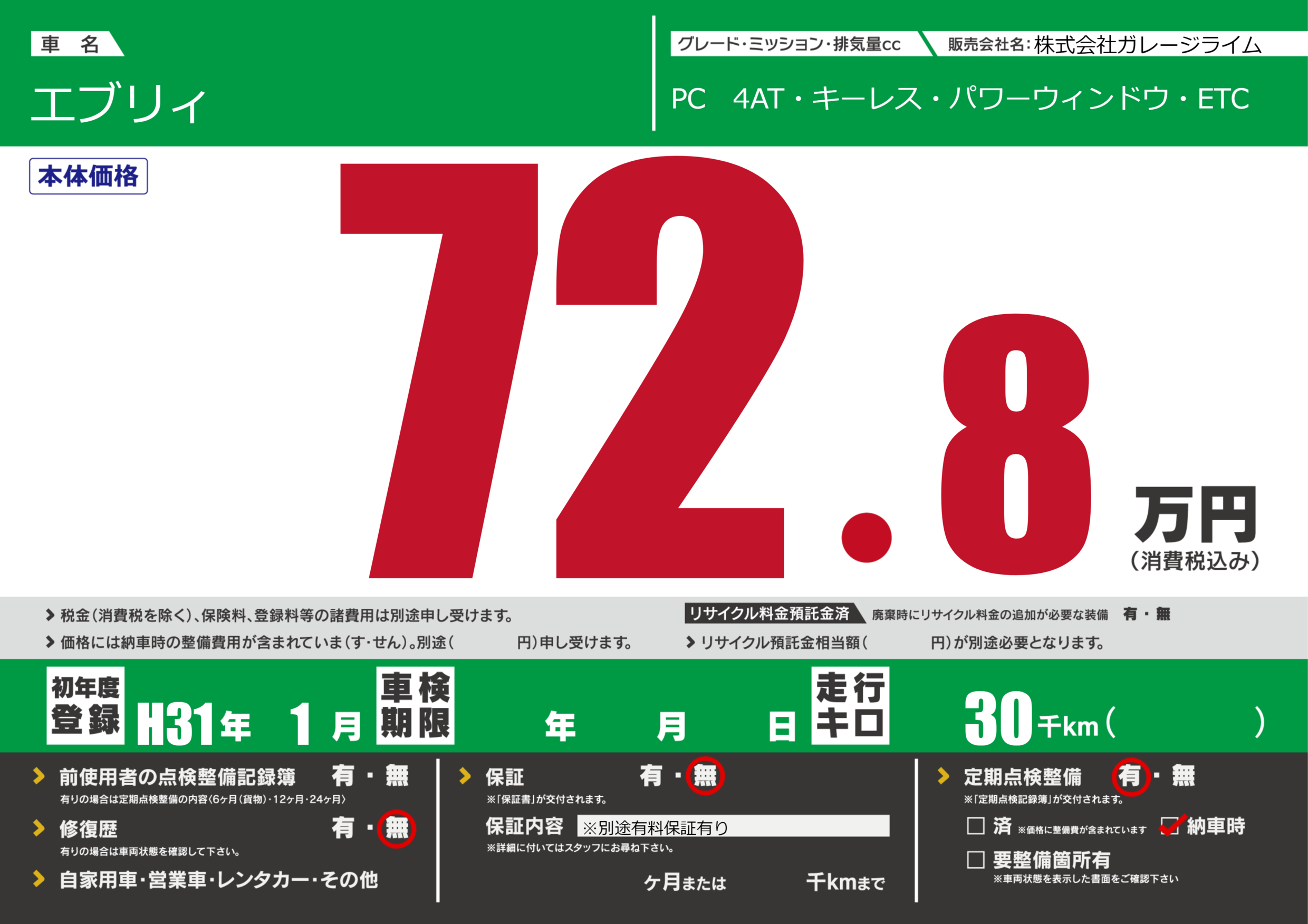 | 車名 | エブリィ | グレード ミッション 排気量 |