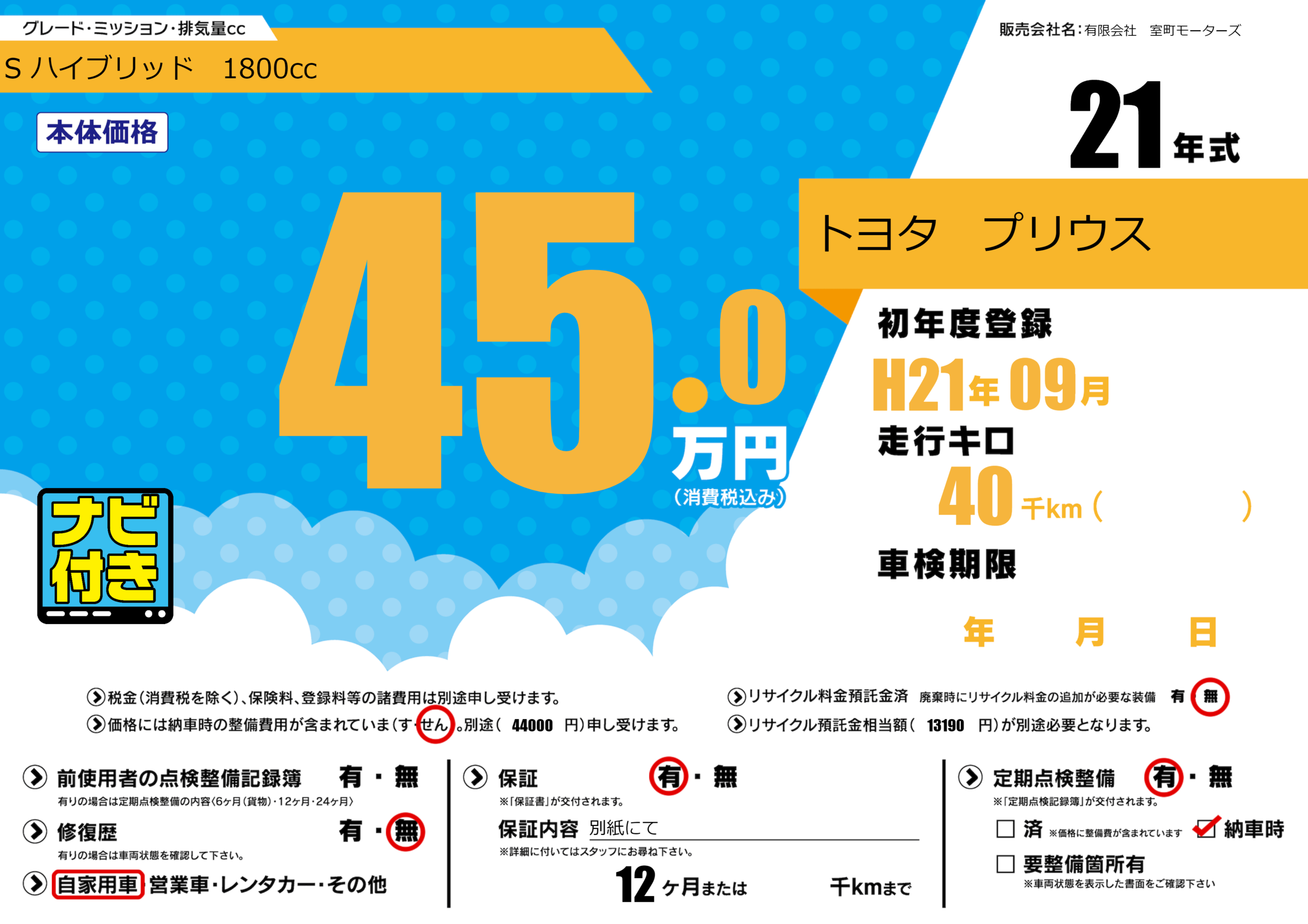 保証付き 保証内容(別紙にて) 12ヶ月または()千kmまで |