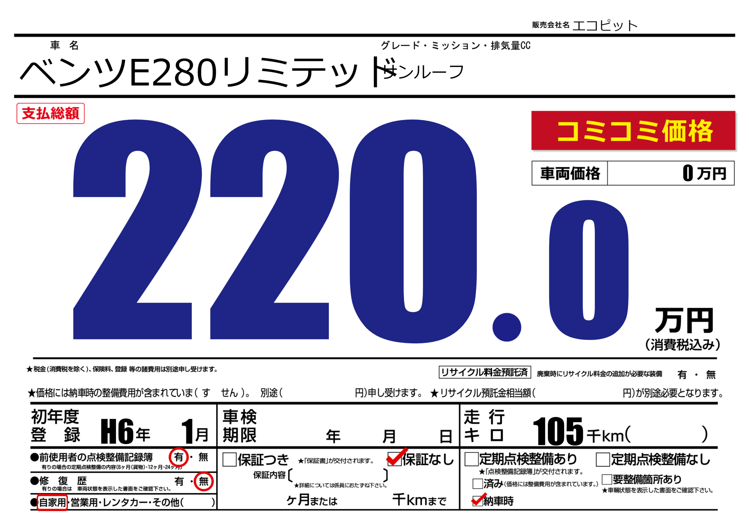 | 車名 | ベンツE280リミテッド | グレード ミッション 排気量 |