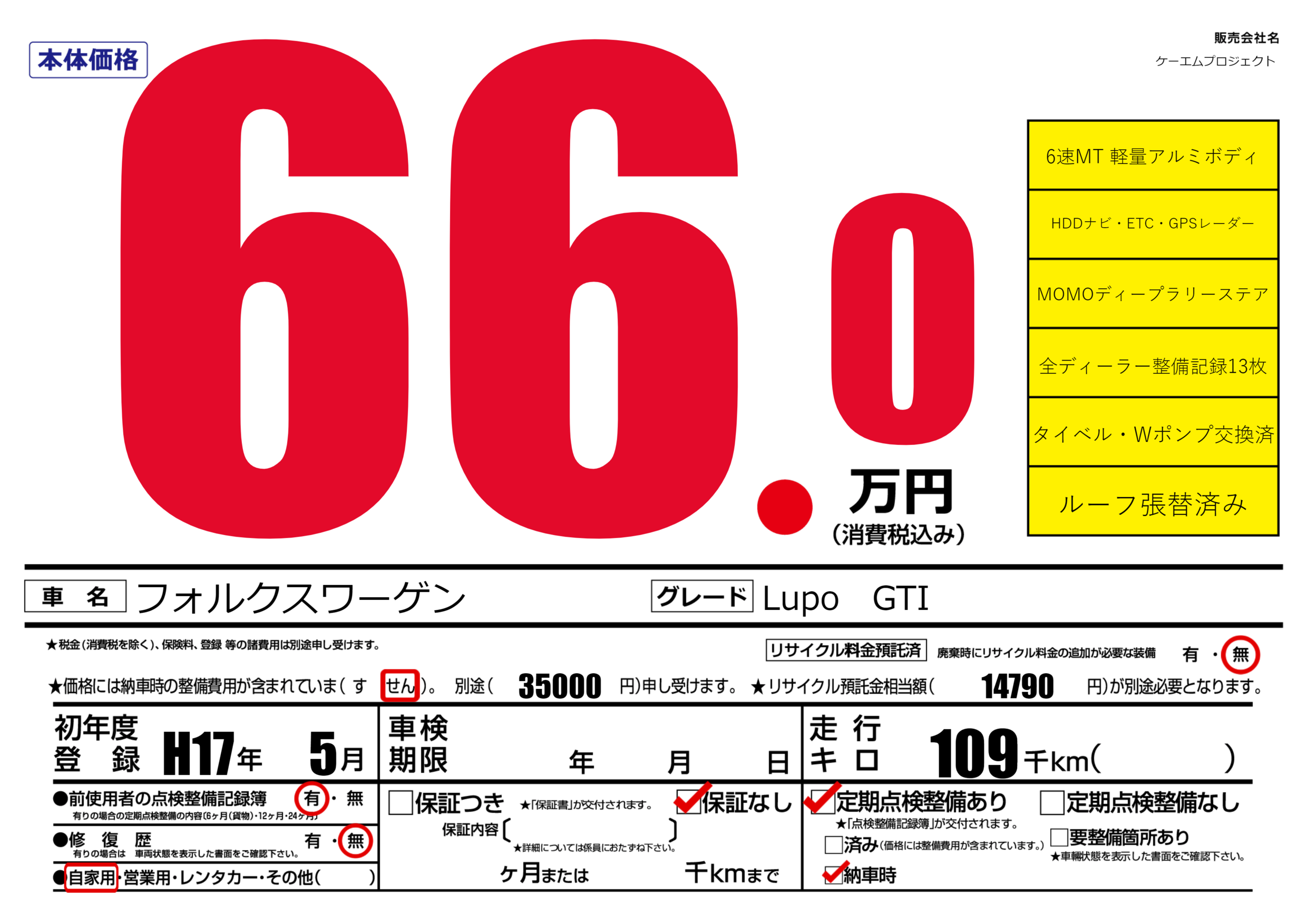 | 走行キロ | 10.9万km | 初年度登録 | H17年5月 |