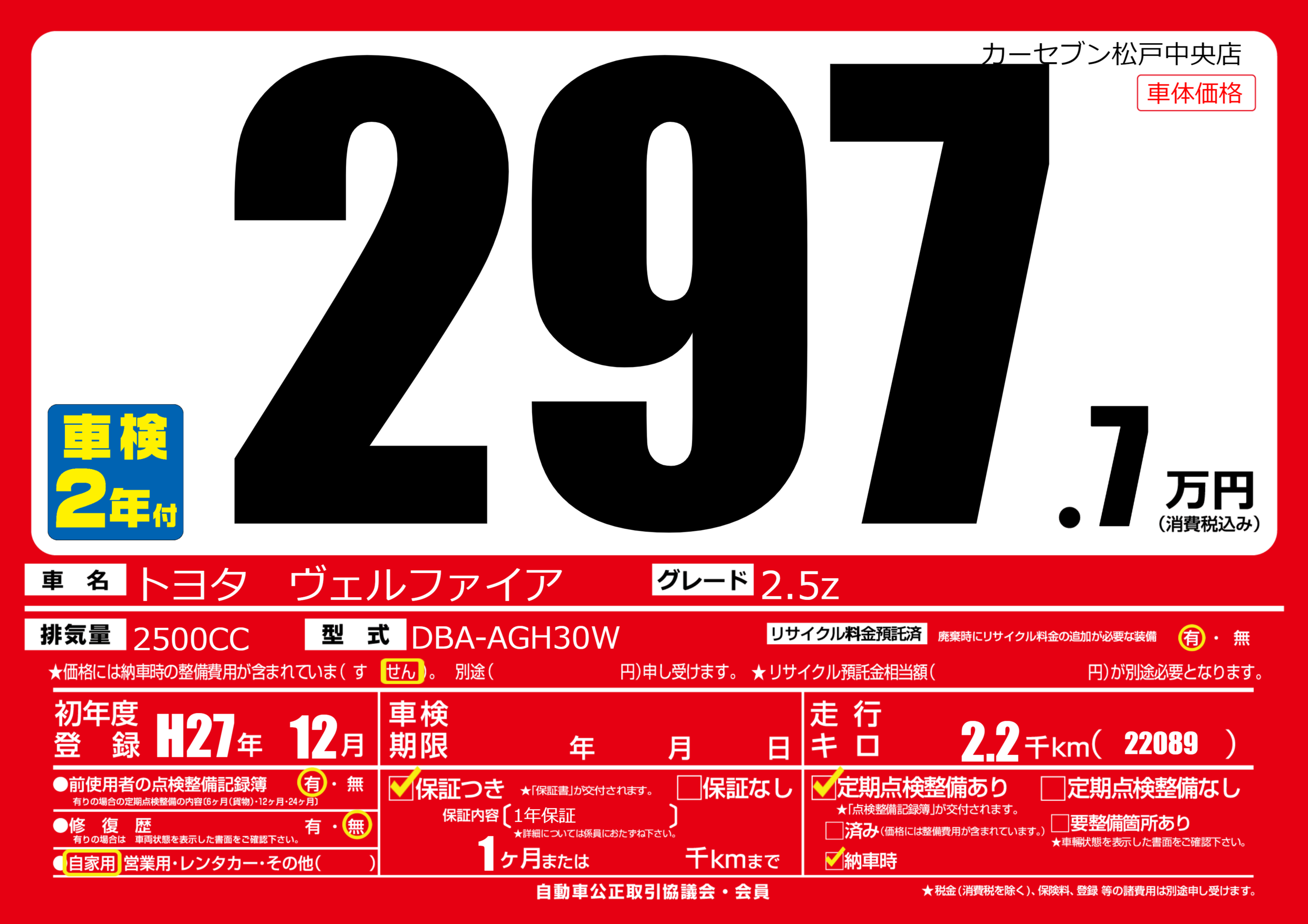 | 車名 | トヨタ ヴェルファイア | グレード ミッション 排気量 |