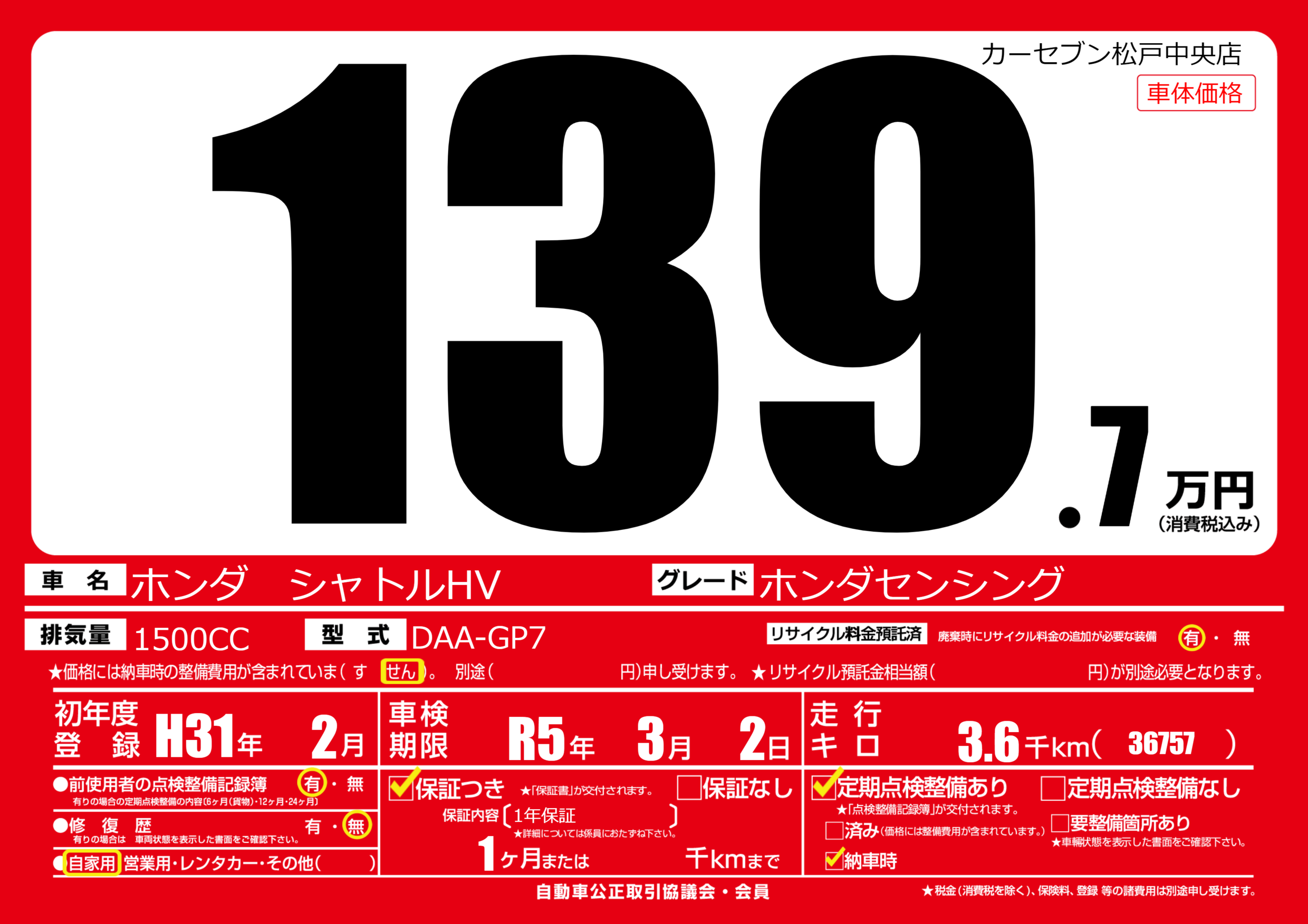 | 車名 | ホンダ シャトルHV | グレード ミッション 排気量 |
