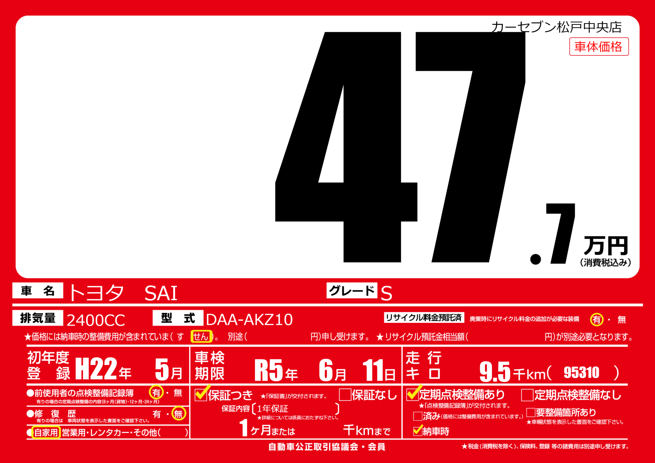 | 車名 | トヨタ SAI | グレード ミッション 排気量 |