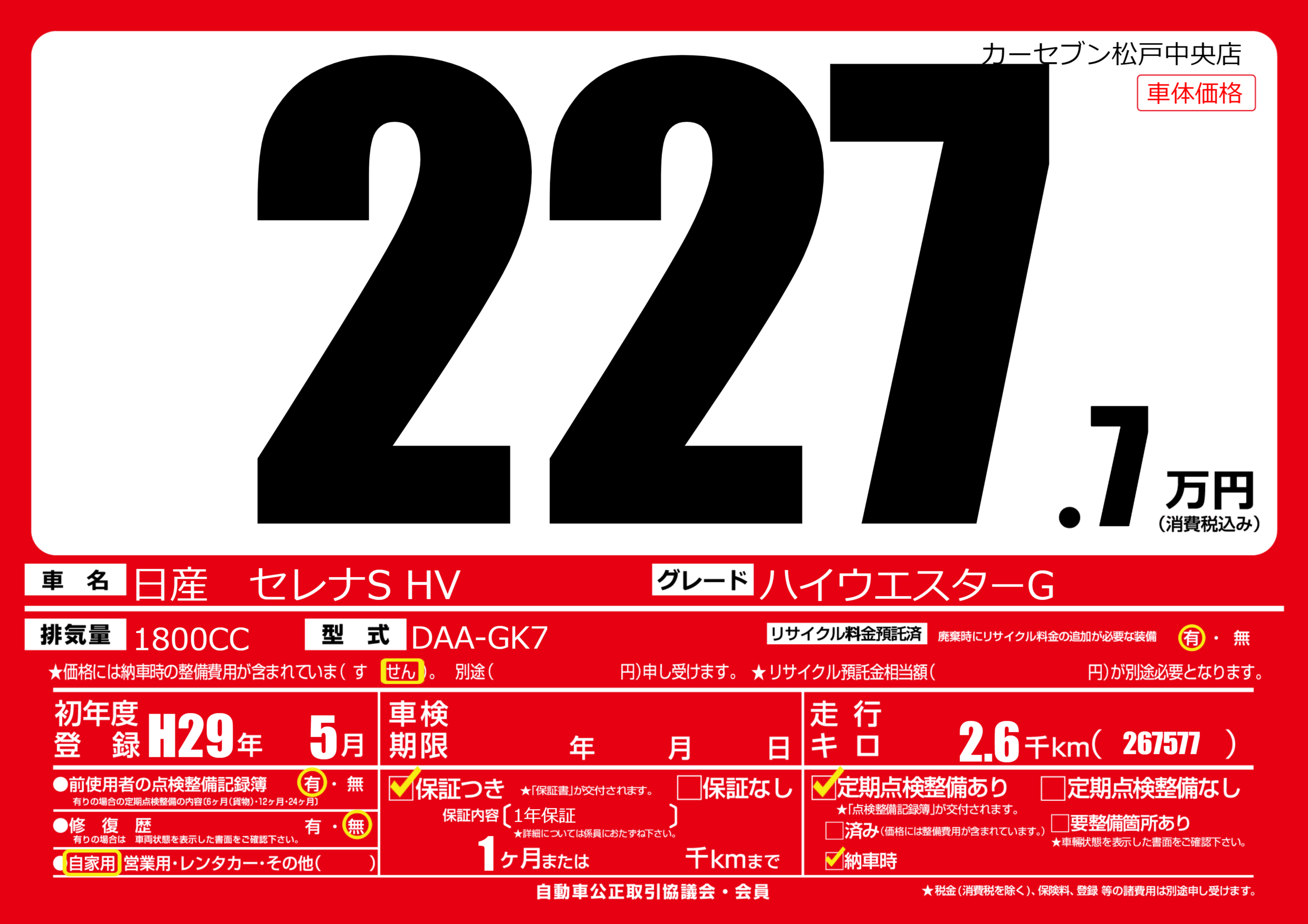 | 車名 | 日産 セレナS HV | グレード ミッション 排気量 |