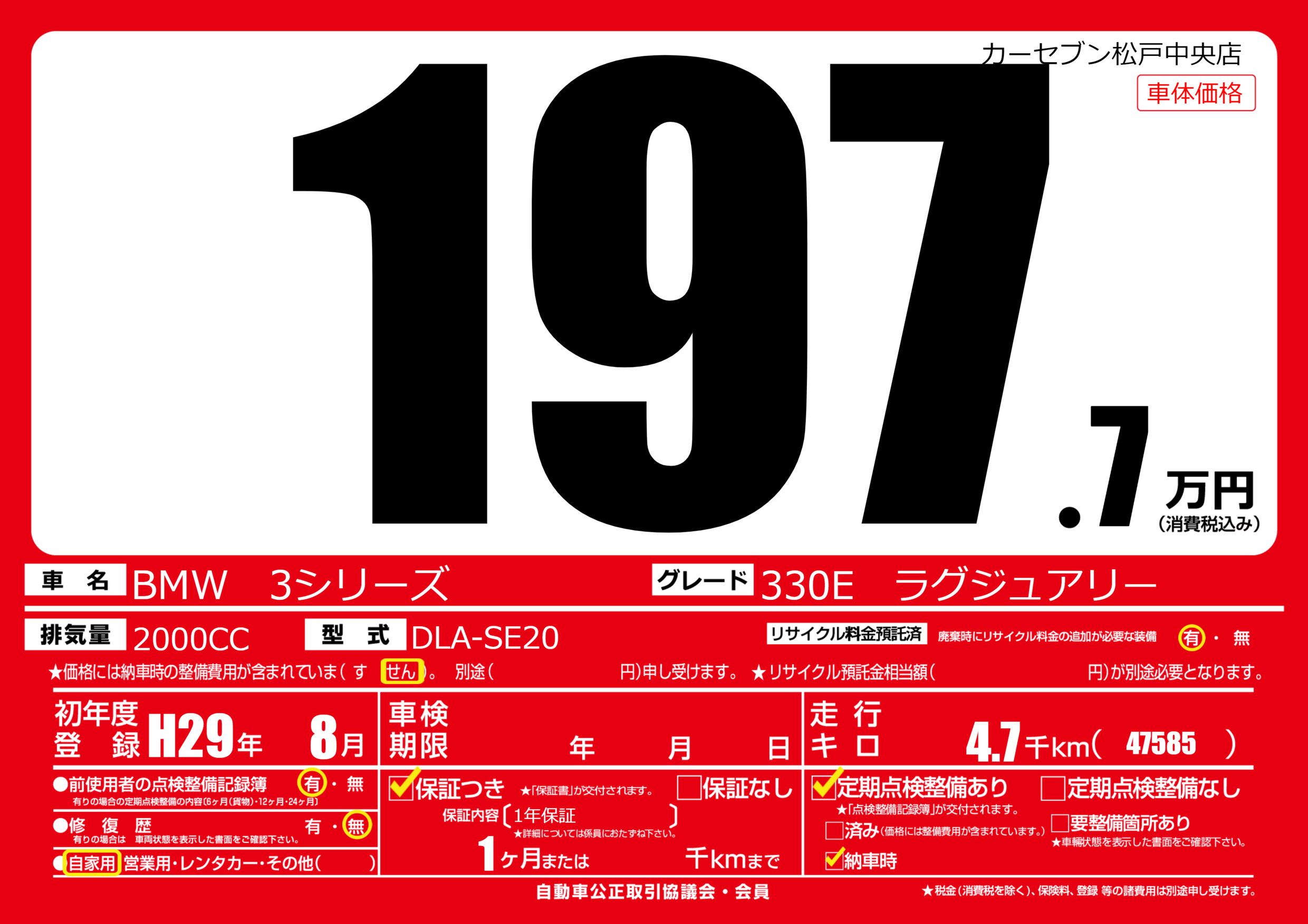 | 車名 | BMW 3シリーズ | グレード ミッション 排気量 |