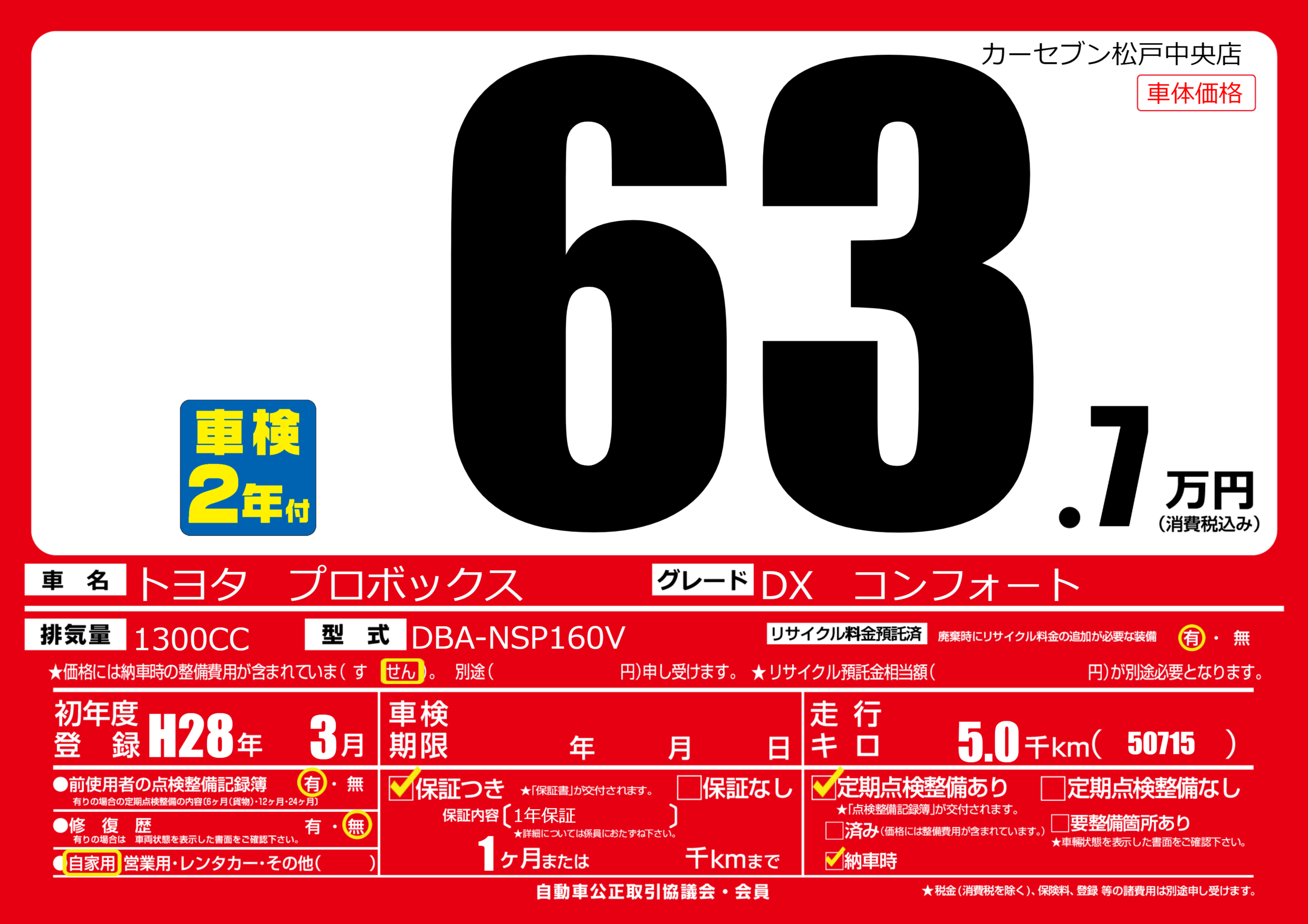 | 車名 | トヨタ プロボックス | グレード ミッション 排気量 |