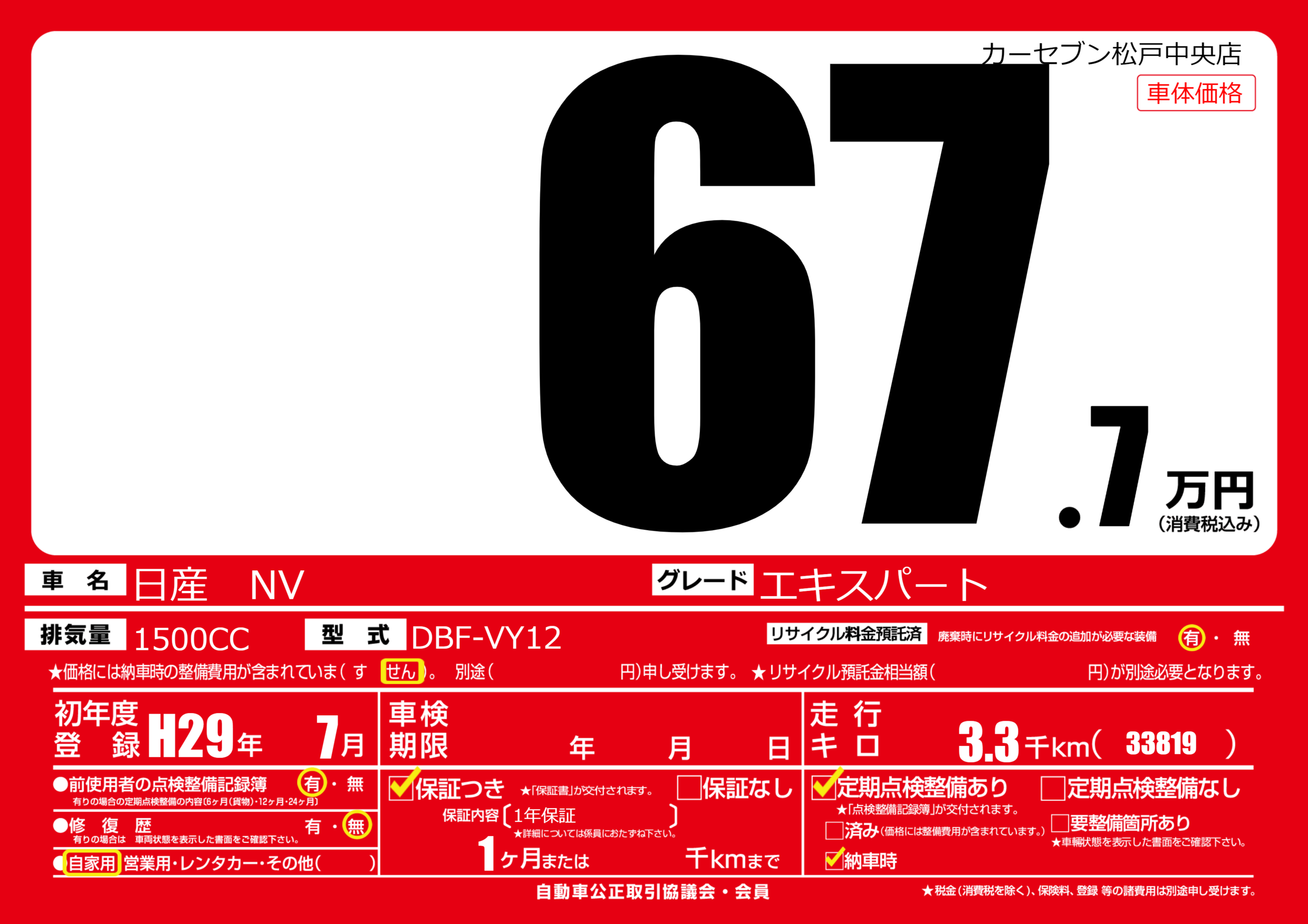 | 車名 | 日産 NV | グレード ミッション 排気量 |