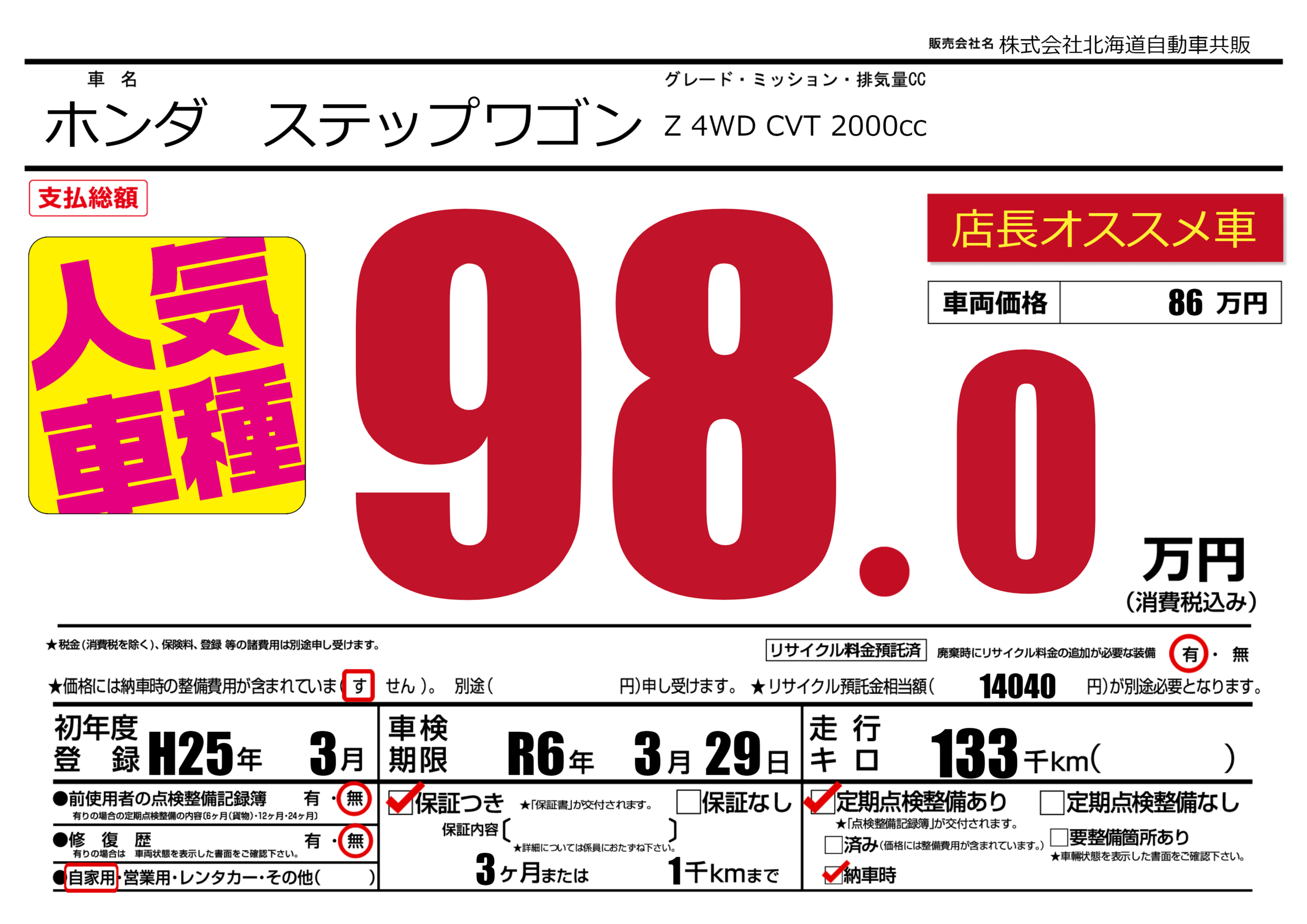 | 走行キロ | 13.3万km | ||
