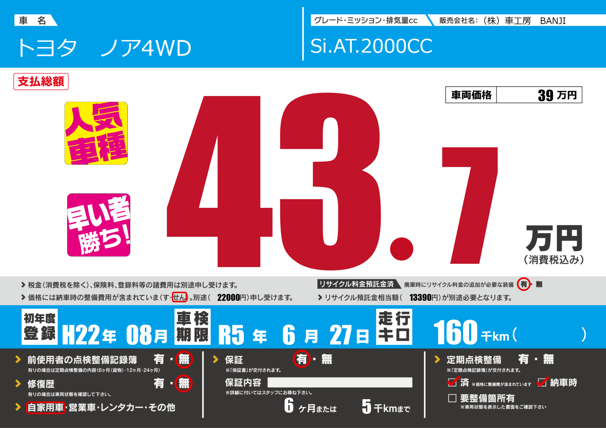 | 車名 | トヨタ ノア4WD | グレード ミッション 排気量 |