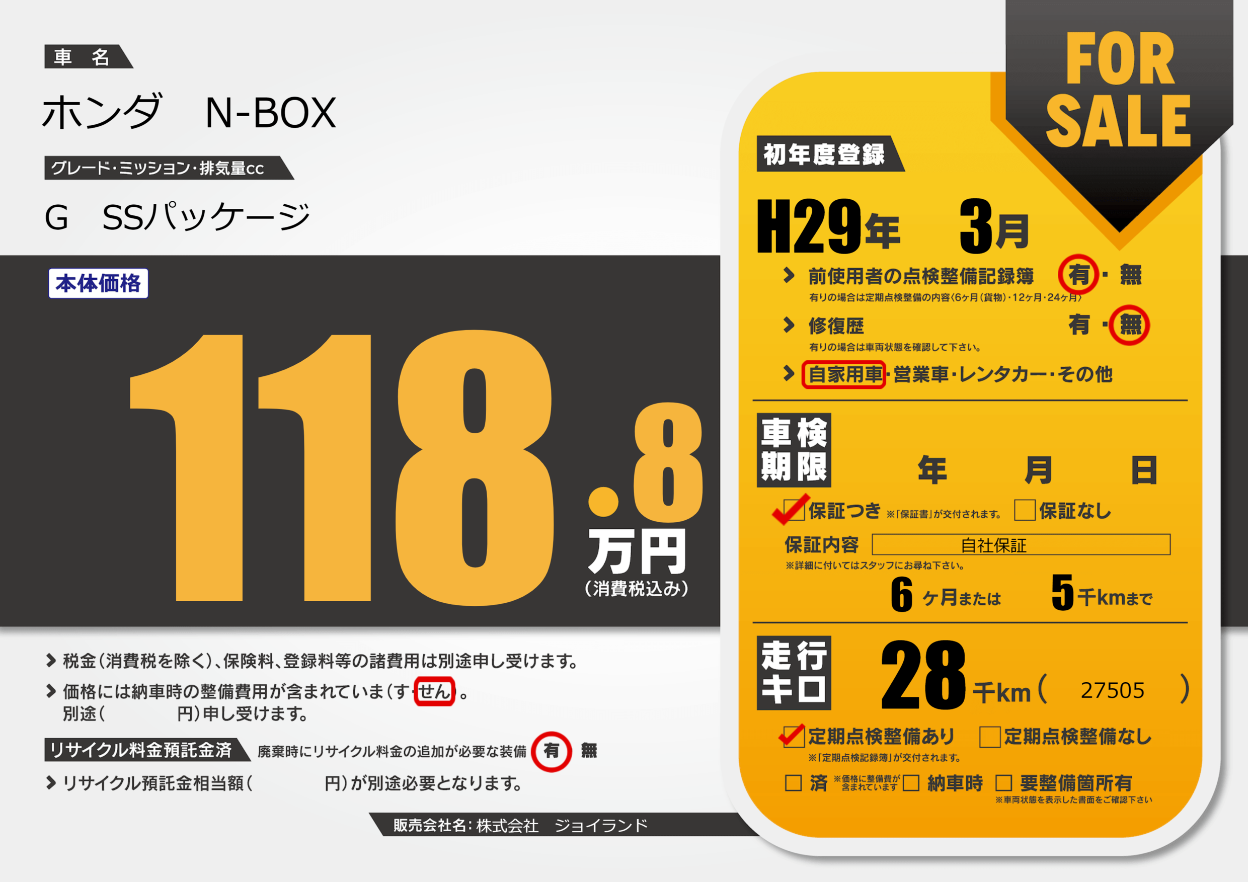 | 車名 | ホンダ N-BOX | グレード ミッション 排気量 |