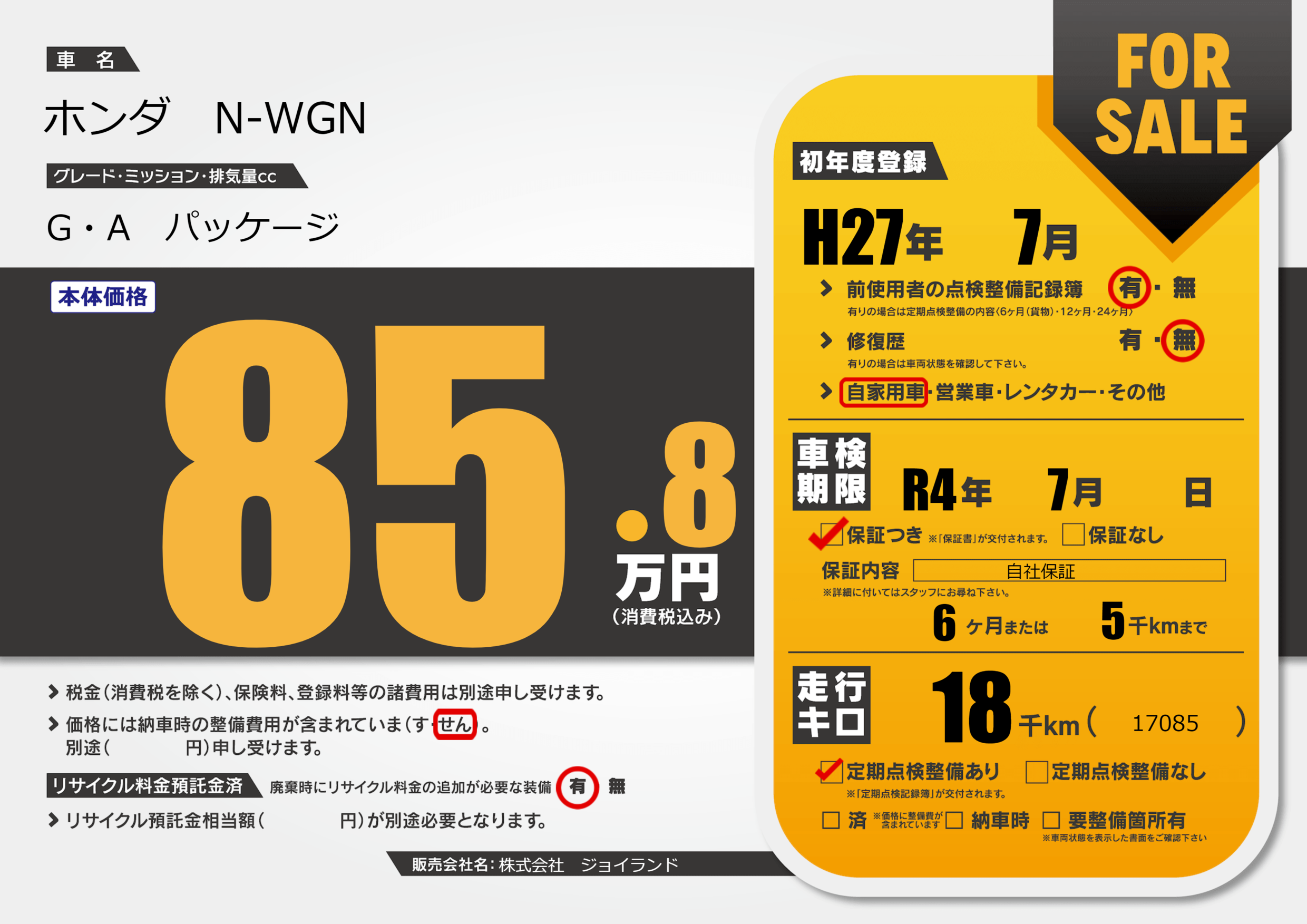 | 車名 | ホンダ N-WGN | グレード ミッション 排気量 |