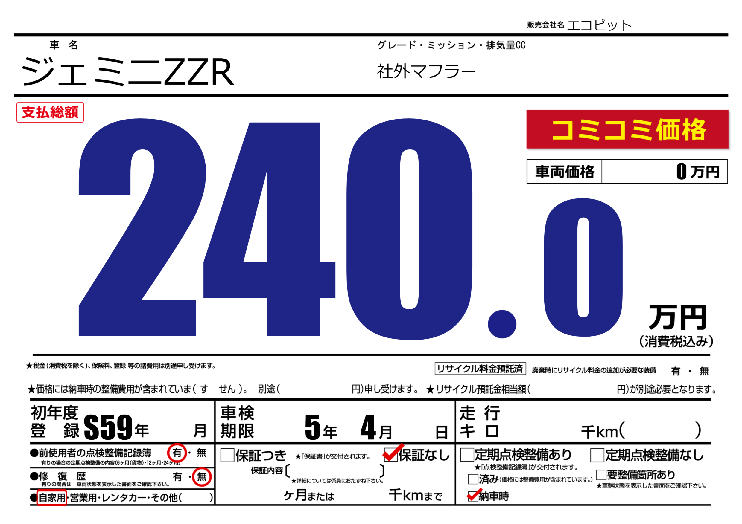 | 車名 | ジェミニZZR | グレード ミッション 排気量 |