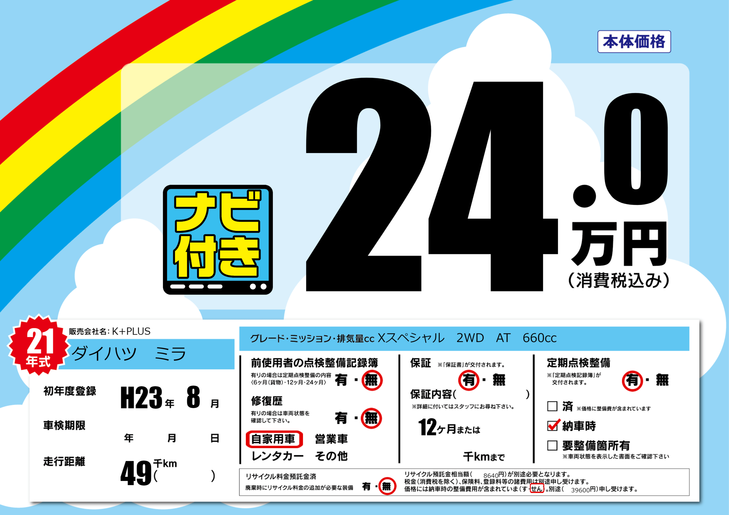 | 走行キロ | 4.9万km | 初年度登録 | H23年8月 |