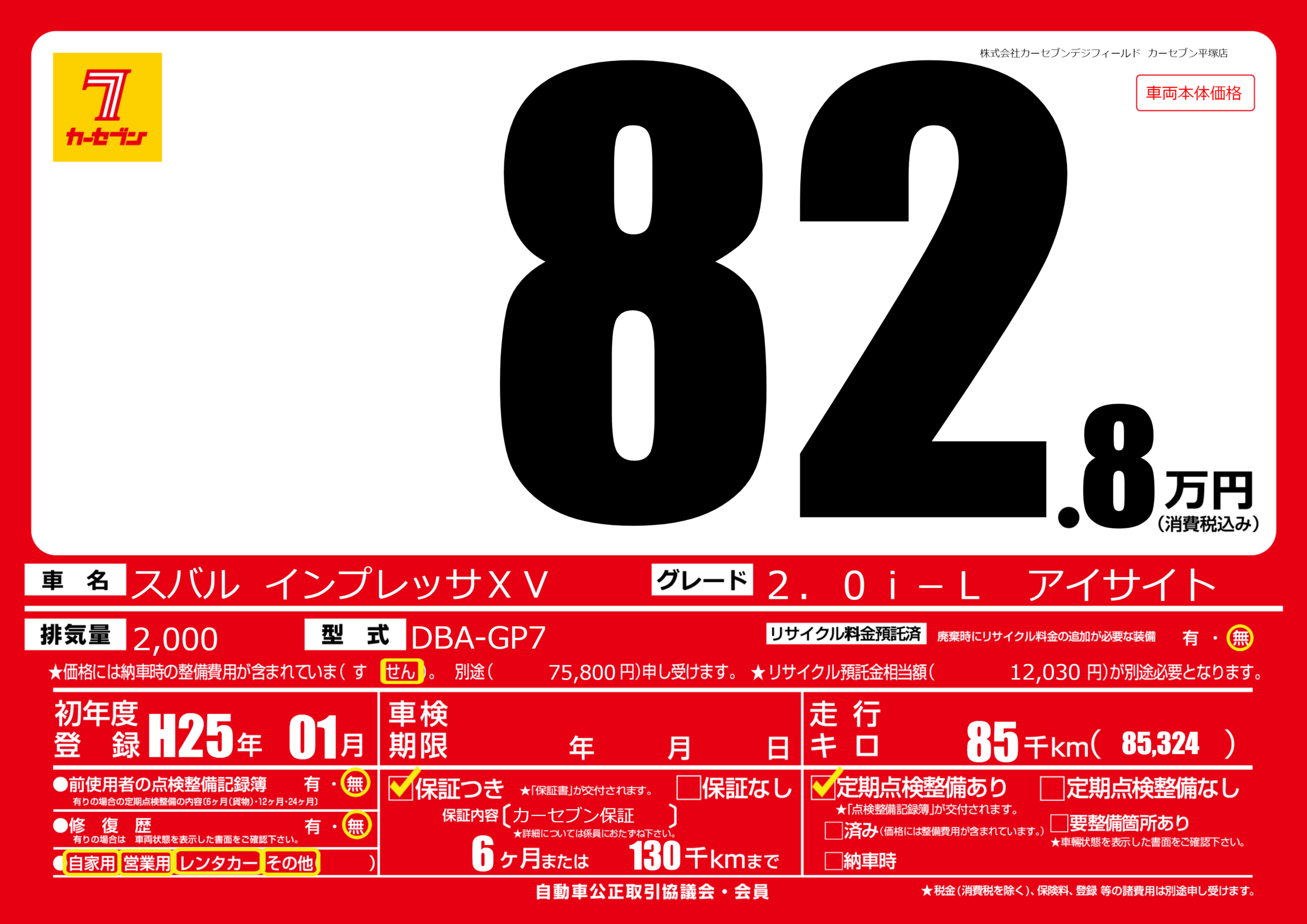 保証付き 保証内容(カーセブン保証) 6ヶ月または(130)千kmまで |