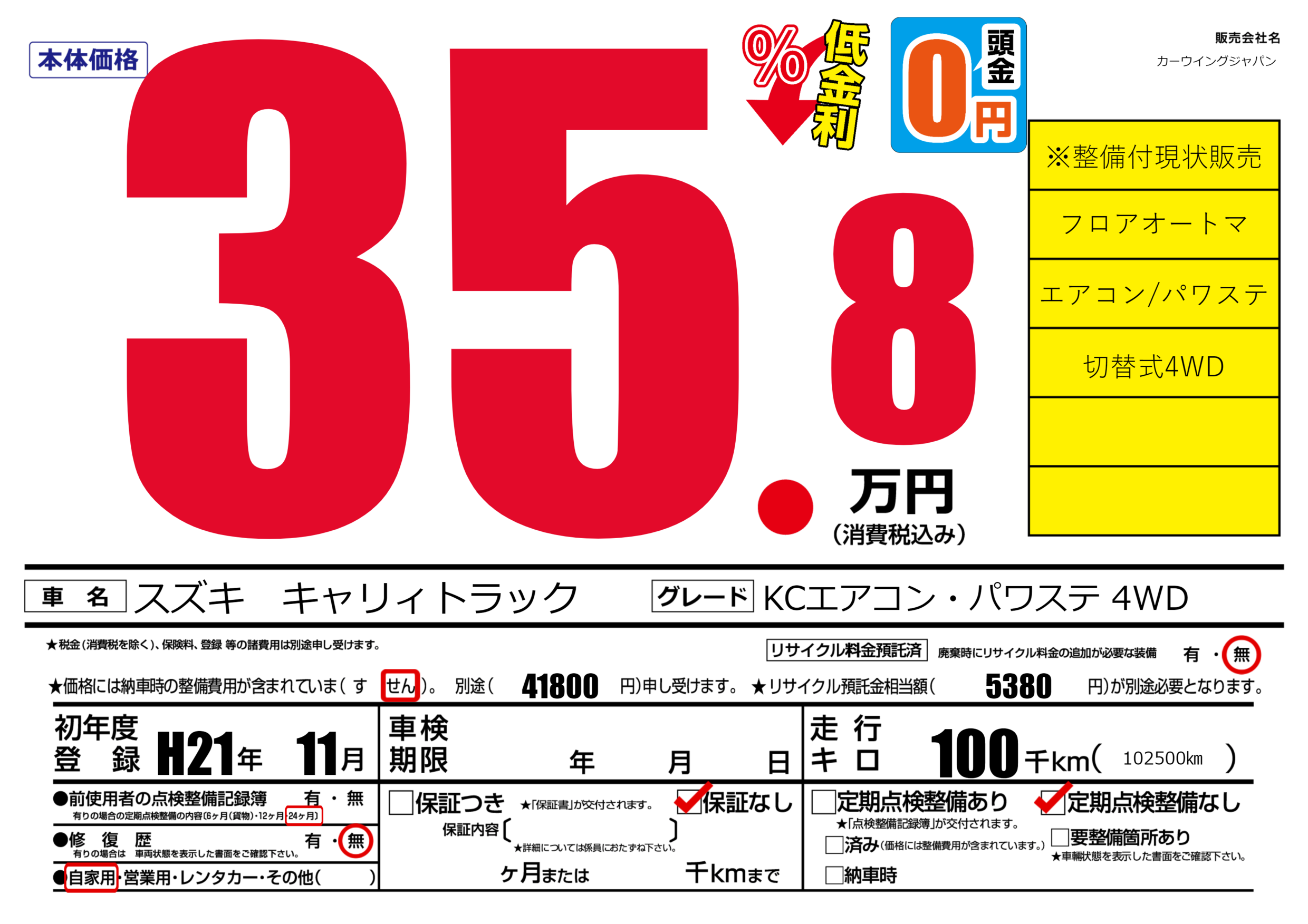 | 走行キロ | 10万km | 初年度登録 | H21年11月 |