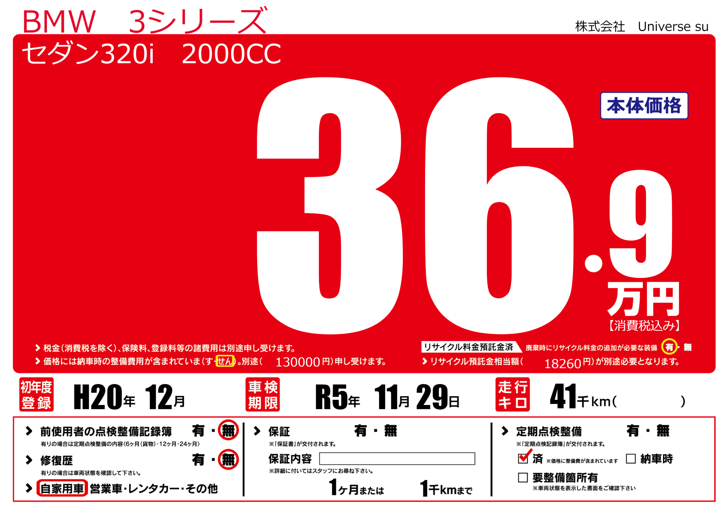 | 車名 | BMW 3シリーズ | グレード ミッション 排気量 |