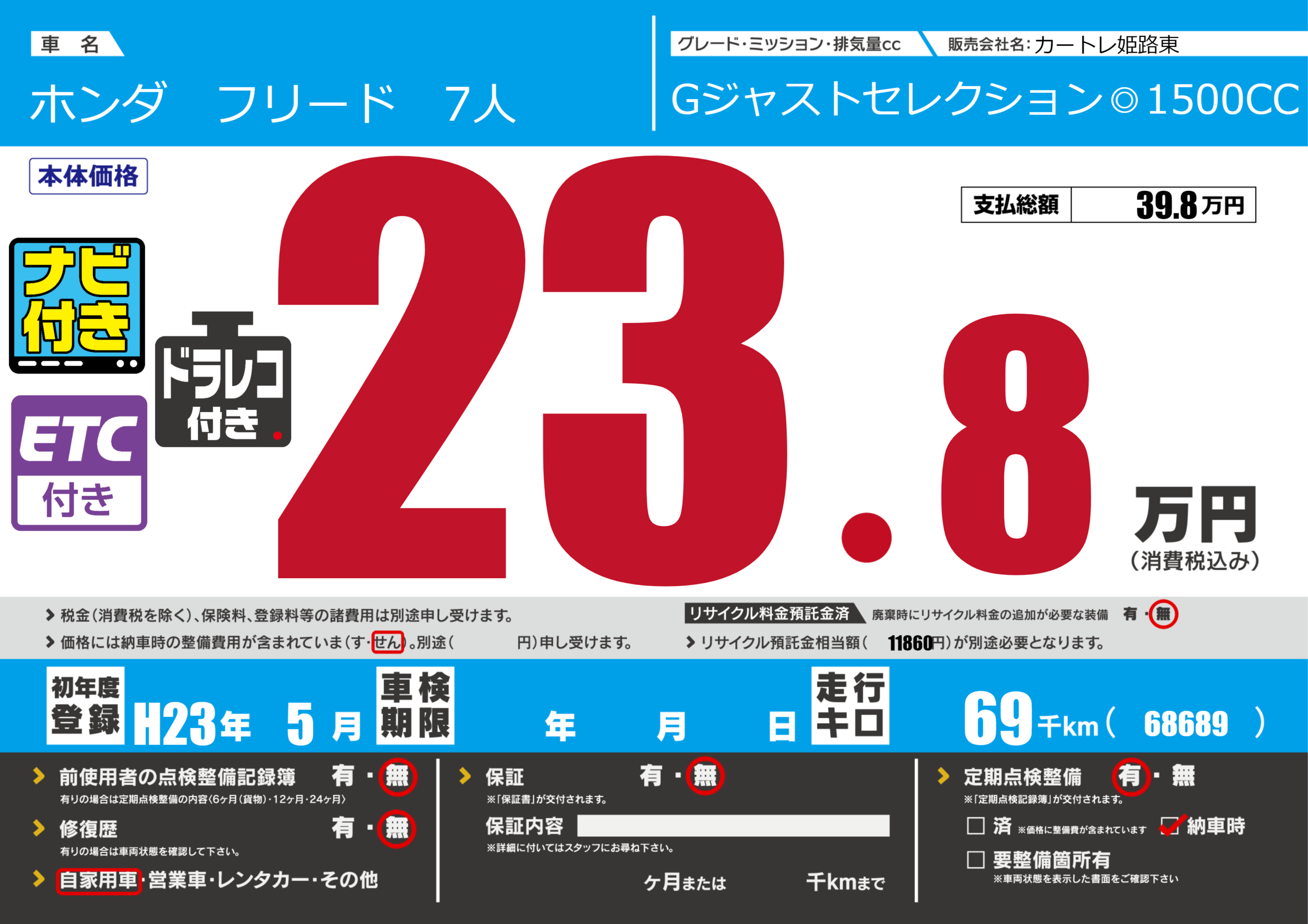 | 車名 | ホンダ フリード 7人 | グレード ミッション 排気量 |